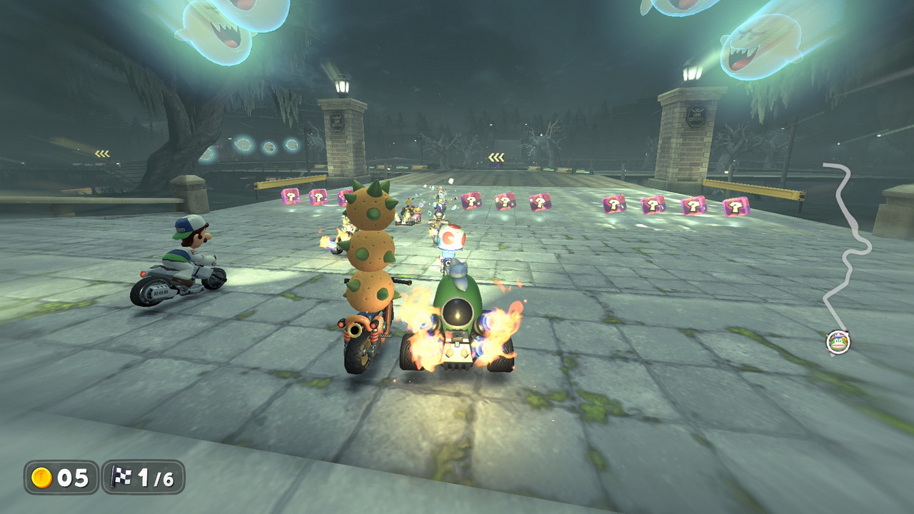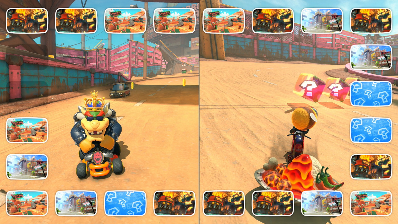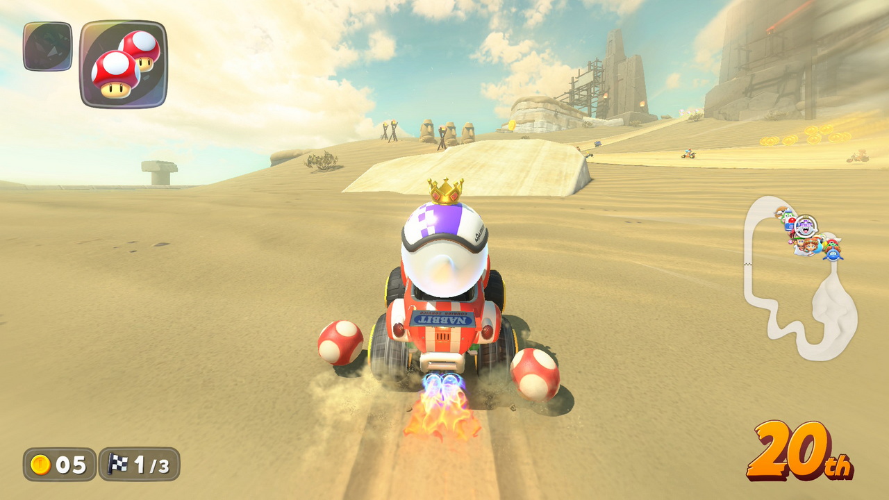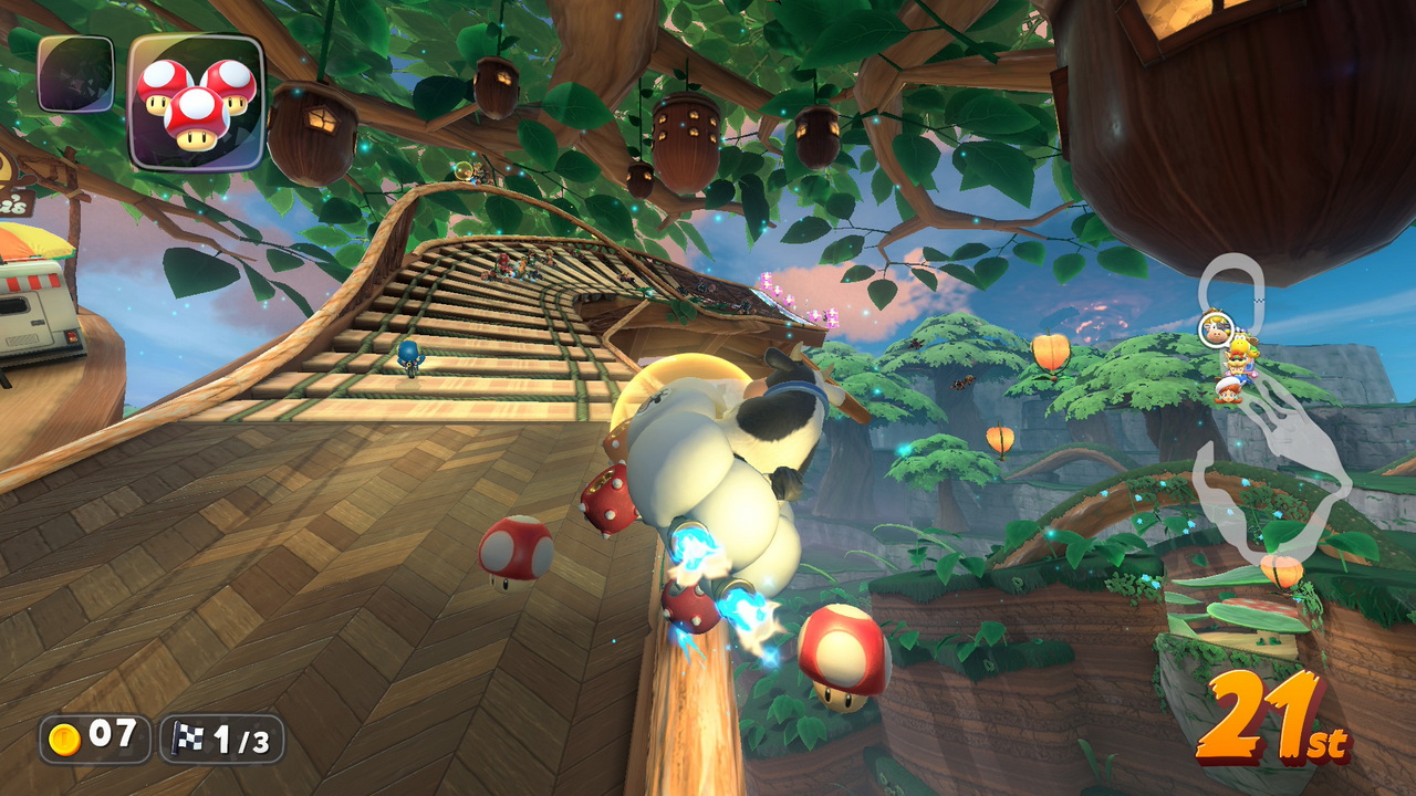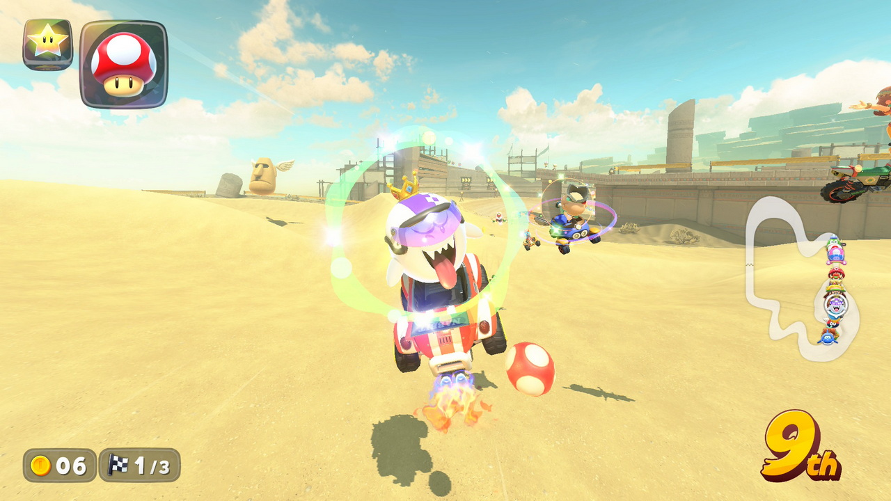 To Knockout Tour λοιπόν, είναι εθιστικά διασκεδαστικό. Σε αυτό, 24 (ναι, 24) διαγωνιζόμενοι, τρέχουν από την μια άκρη του χάρτη στην άλλη, περνώντας από ανοικτό κόσμο αλλά και πίστες του παιχνιδιού, προσπαθώντας να περάσουν την γραμμή του επόμενου checkpoint χωρίς να είναι στα τέσσερα τελευταία Kart που θα το κάνουν. Αν κάποιος βρίσκεται στα τέσσερα τελευταία Kart, αποκλείεται από τον αγώνα, αφήνοντας λιγότερους να διαγωνιστούν για την νίκη. Είναι ότι κοντινότερο μπορούσε να χαρακτηριστεί ως “Battle Royale” σε ένα παιχνίδι τέτοιου είδους. Υπάρχουν οκτώ διαφορετικές διαδρομές, οι οποίες απλώνονται στον καταπληκτικό ανοιχτό κόσμο του παιχνιδιού. Ένας αγώνας, με την προϋπόθεση ότι φτάνετε στο τελευταίο checkpoint, διαρκεί 15 με 20 λεπτά. Καθ’ όλη την διάρκεια του χρόνου αυτού, οι παίκτες έχουν να διαχειριστούν τον πανζουρλισμό από καβούκια, νομίσματα, μανιτάρια, ρουκέτες, αστεράκια και ότι άλλο μπορεί να χωρέσει στο Mario Kart, προσπαθώντας να οδηγήσουν στρατηγικά για να επιβιώσουν. Οι τέσσερις τελευταίοι, τρέχουν έναν γύρο στην πίστα που καταλήγει η διαδρομή του Knockout, για να αποφασιστεί ο τελικός νικητής. Ειλικρινά, αν το παιχνίδι ερχόταν μόνο με αυτό το mode, θα ήταν αρκετό για να μας κρατήσει για χρόνια.