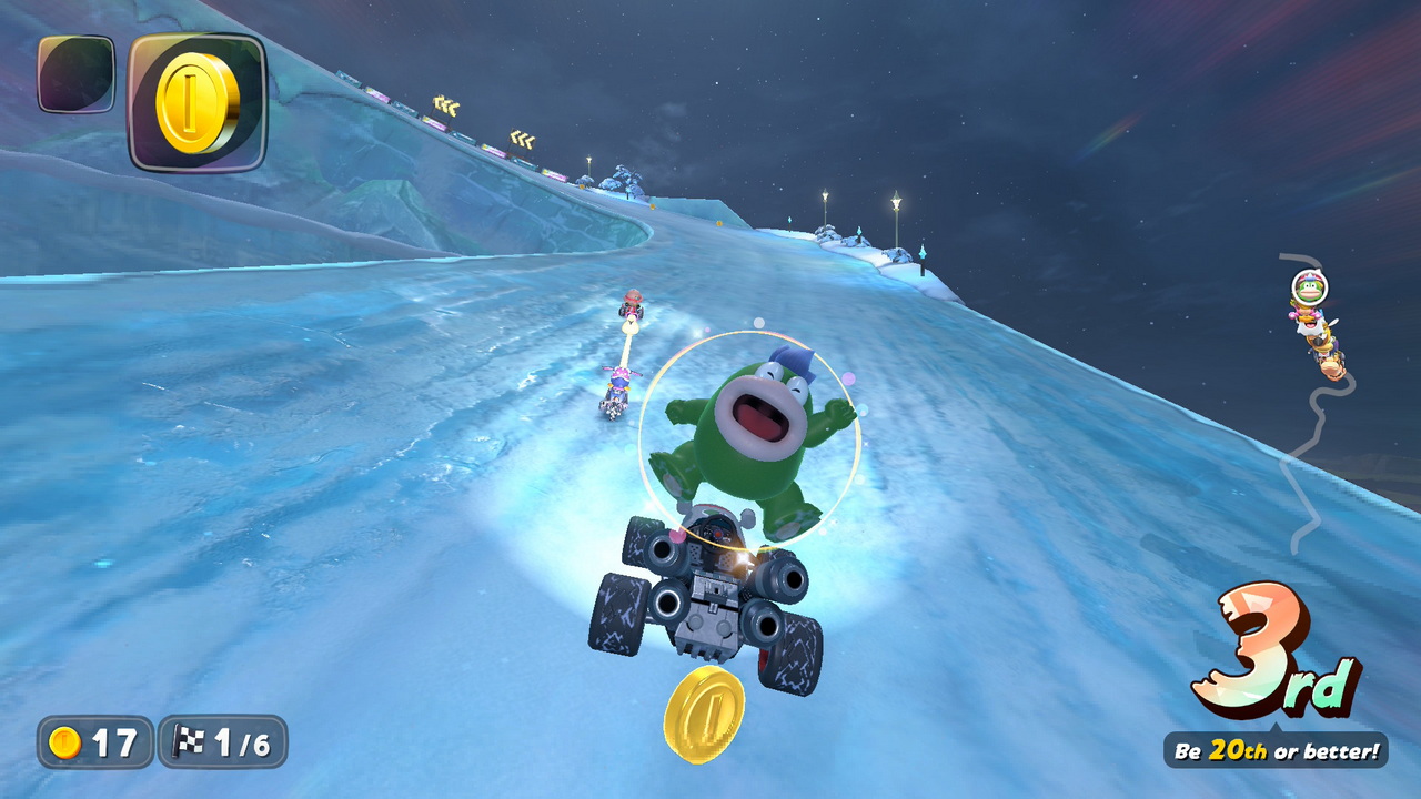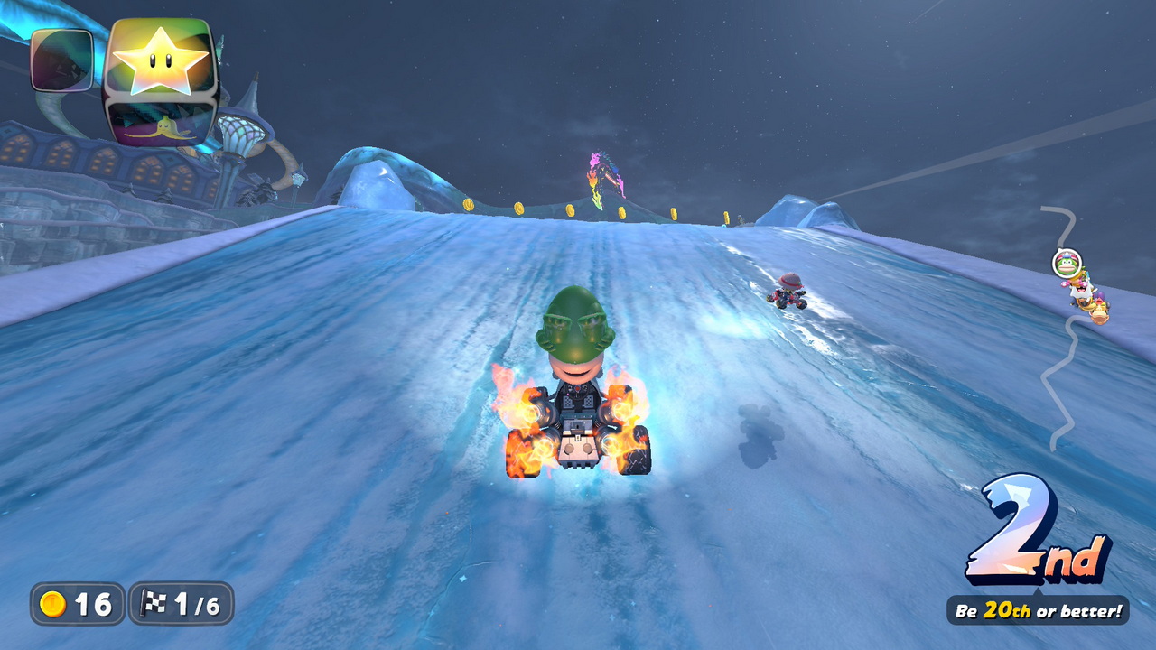 Ένα άλλο παράπονο, είναι πως δεν υπάρχει διαθέσιμη επιλογή για 200cc race, σε κανένα mode, κάτι το οποίο επίσης θα λείψει στους έμπειρους παίκτες. Υπάρχουν μόνο 50cc, 100cc και 150cc επιλογές. Κλείνοντας με τα του ανοιχτού χάρτη, περνάμε στα παραδοσιακά Time Trials. Τα Time Trials είναι ακριβώς ίδια με αυτά του Mario Kart 8 Deluxe. Σε όλα υπάρχει καταγεγραμμένος ένας χρόνος από developer του game, με το χαρακτηριστικό “Nin” μπροστά από το όνομά του. Ο παίκτης καλείται να περάσει τους χρόνους των developers, καθώς και αν επιθυμεί, να κατεβάσει τις επιδόσεις των καλύτερων στον κόσμο για να βελτιώσει τις ικανότητές του σε κάθε πίστα. Αξιοπερίεργο το να θέλει κανείς να το κάνει, αφού στο 80% των πιστών, τρέχουμε μόνο έναν γύρο, λόγω των αλλαγών που προαναφέραμε. Στα time trials δεν υπάρχουν power-ups, ως συνήθως ο παίκτης ξεκινά με τρία μανιτάρια και πρέπει να τα υλοποιήσει σε βάθος τριών γύρων για να κάνει τον καλύτερο χρόνο που μπορεί.