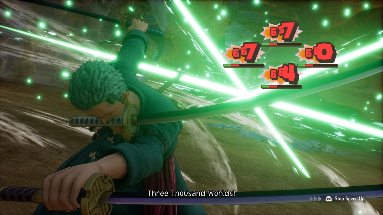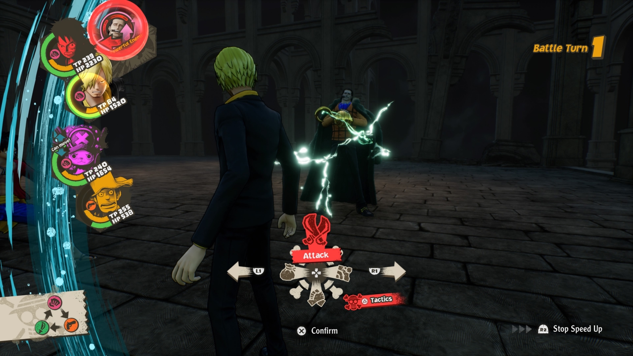 Αυτά τα αξεσουάρ είναι που λίγο-πολύ καθορίζουν τον ρόλο του καθενός (μετά τα skills, προφανώς). Για παράδειγμα, δίνοντας έμφαση σε στατιστικά επίθεσης, ο Luffy μπορεί να γίνει καθαρά επιθετικός χαρακτήρας όμως μπορούν να ενισχυθούν τα στατιστικά άμυνας και HP για να τον κάνουν ένα είδος tank. Μετά την Arabasta, οι παίκτες θα μπορούν να συνδυάζουν αξεσουάρ για να εμπλουτίζουν τις ιδιότητές τους, οπότε με ένα αξεσουάρ να κερδίζουν σε πολλαπλά μέτωπα. Ο Chopper, για παράδειγμα, στηρίζεται πολύ στα skills του, άρα βγάζει πολύ νόημα να εστιάσει κανείς στο TP Cost Reduction για να καταναλώνει όσο λιγότερο TP γίνεται με κάθε skill. Το TP είναι κάτι σαν MP και καταναλώνεται με κάθε χρήση skill, αλλά ευτυχώς, αναπληρώνεται κάνοντας απλές επιθέσεις στους εχθρούς κι έτσι δεν χρειάζεται κάποια διαχείριση που να στηρίζεται εξ ολοκλήρου σε αναλώσιμα items (παρότι υπάρχουν κι αυτά). Γενικά, υπάρχει βάθος στο παιχνίδι και στις μάχες, όμως χρειάζεται περίπου 6-7 ώρες για να αρχίσει να δίνει τα ηνία στον παίκτη. Δεδομένου ότι το παιχνίδι κρατάει περίπου 40 ώρες, δεν είναι και αμελητέο διάστημα – πρακτικά, πρόκειται για σχεδόν 6 ώρες διάφορων tutorial.