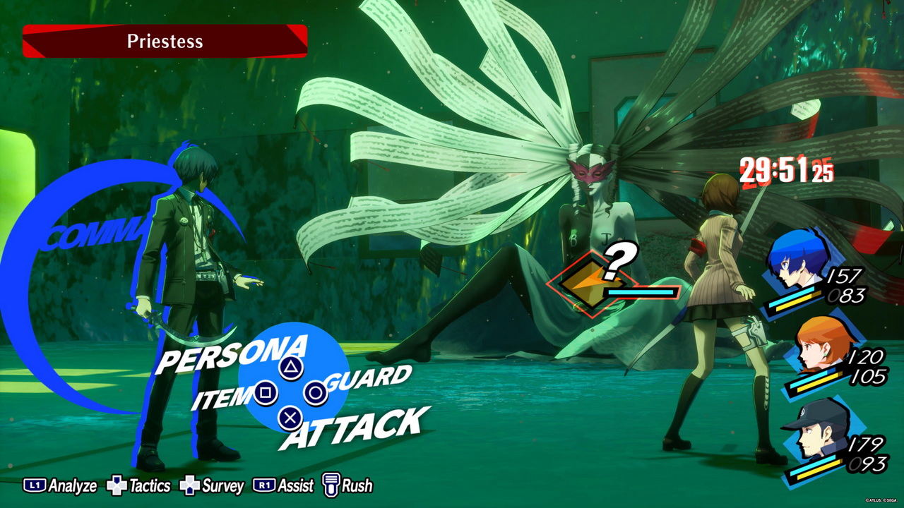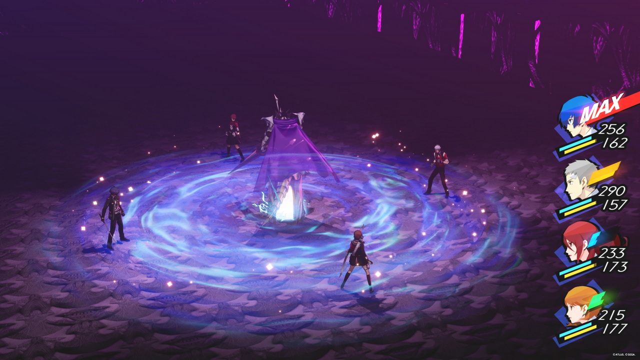 Επιπλέον, το shadow που θα δεχθεί επίθεση σε αδύναμο σημείο, θα μπει σε κατάσταση “Weak”. Αν μπορέσετε εκμεταλλευόμενοι το shift να αποδυναμώσετε όλους τους αντιπάλους, χτυπώντας με επιθέσεις που πρέπει, τότε μπορείτε να εξαπολύσετε ένα All-Out Attack, στο οποίο όλα τα μέλη του party κάνουν ταυτόχρονη επίθεση σε όλα τα shadows, πραγματοποιώντας μεγάλη ζημιά. Τα παραπάνω όμως, υπάρχουν και σε παλαιότερα παιχνίδια της σειράς. Το Persona 3 Reload, έχει με διαφορά το πιο ενδιαφέρον σύστημα μάχης από τους προκατόχους του, λόγω του “Theurgy”. Το Theurgy είναι μια πολύ δυνατή επίθεση που μπορεί να πραγματοποιήσει οποιοδήποτε μέλος του S.E.E.S, όταν γεμίσει πλήρως το Theurgy bar. Αυτό γεμίζει μόνο πραγματοποιώντας κινήσεις που ταιριάζουν στον κάθε χαρακτήρα. Έτσι, δημιουργείται η απόλυτη ισορροπία στο party, αφού ουσιαστικά αναγκάζεστε να δημιουργήσετε μια ομάδα που έχει διαφορετικά δυνατά σημεία, προκειμένου να πολεμάτε πιο στρατηγικά και πιο ολοκληρωμένα. Αξίζει να σημειωθεί πως τα animations των Theurgy είναι όλα εκπληκτικά και ιδιαίτερα βοηθητικά στην μάχη, προσφέροντας πολλαπλά κίνητρα για να θέλετε να τα κάνετε.