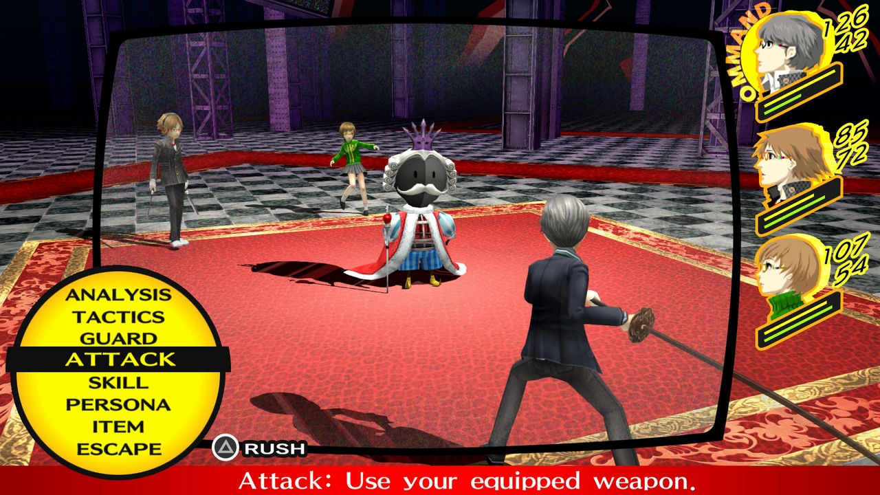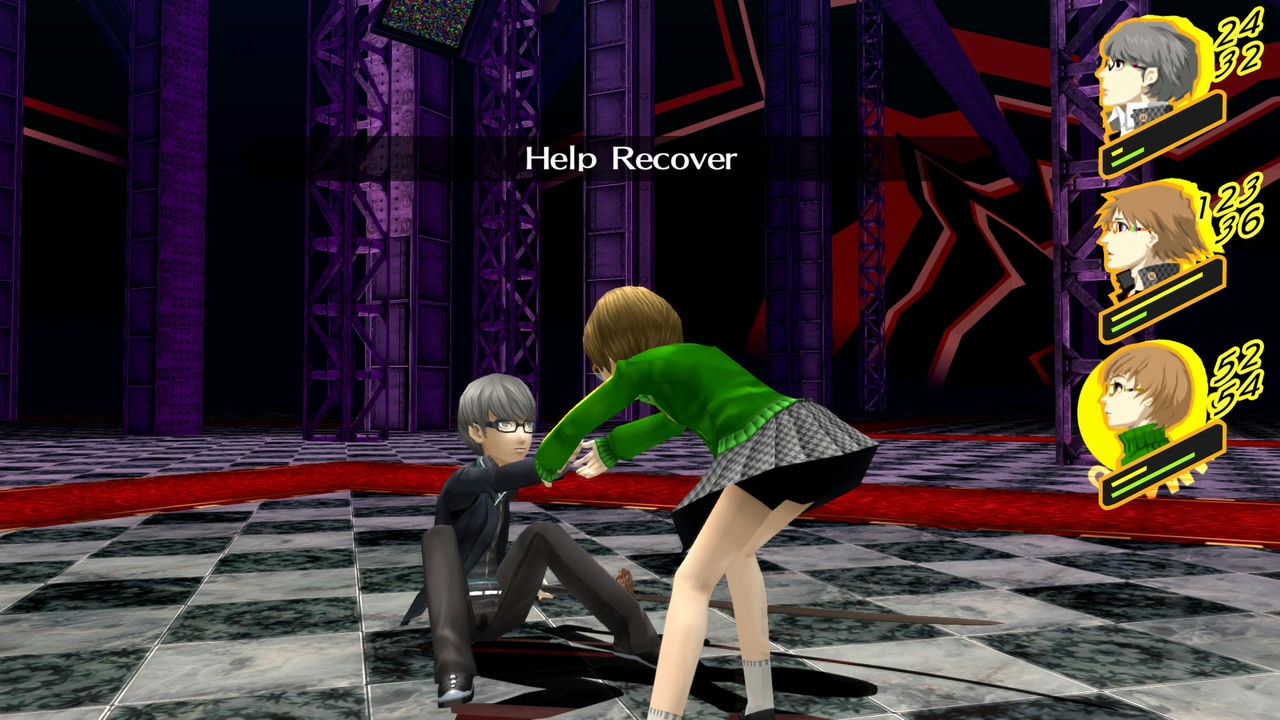 Μέσω του Shuffle Time, που ενεργοποιείται μετά από μια μάχη, οι παίκτες έχουν την ευκαιρία να αποκτήσουν buffs, αντικείμενα ή Persona για τον Yu. Όσο αποκτά εμπειρία, ο Yu μπορεί να χρησιμοποιεί περισσότερα Personas ώστε στη διάρκεια μιας μάχης, να αλλάζει από το ένα στο άλλο. Η μάχη γίνεται σε γύρους, με κάθε χαρακτήρα να έχει έναν γύρο όμως αν οι παίκτες χτυπήσουν την αδυναμία ενός εχθρού, τότε κερδίζουν έναν ακόμη γύρο (ένας γύρος για κάθε φορά που συμβαίνει). Αν όλοι οι εχθροί χτυπηθούν στην αδυναμία τους και βρεθούν ταυτόχρονα στο έδαφος, τότε δίνεται η δυνατότητα για ένα ισχυρό All-Out Attack από όλη την ομάδα. Μπορούν και να προσπεράσουν το All-Out Attack για να κάνουν οποιαδήποτε άλλη κίνηση, π.χ. χρήση αντικειμένου για αναπλήρωση HP ή SP (που χρησιμοποιείται για ικανότητες των Personas). Βέβαια, τα ίδια ισχύουν και για τους αντιπάλους, πλην του All-Out Attack. Ένα επίσης καλό στοιχείο, είναι η δυνατότητα χειρισμού κάθε μέλους του party ξεχωριστά ή αυτόνομη λειτουργία βάσει γενικών εντολών (π.χ. Support). Επομένως, οι μάχες δεν είναι απλή υπόθεση αλλά απαιτούν στρατηγική. Είναι εύκολο οι παίκτες να βρεθούν αντιμέτωποι με εχθρούς που δεν είναι ιδιαίτερα ισχυροί, όμως χτυπάνε στην αδυναμία του παίκτη και κερδίζουν διαρκώς γύρους ενώ ο παίκτης χάνει γύρους για να σηκωθεί από το έδαφος ο χαρακτήρας. Αυτή η δυναμική έρχεται και συνδυάζεται τέλεια με τον μηχανισμό σύνθεσης Persona, παροτρύνοντας τους παίκτες να πειραματίζονται και να «διαβάζουν» τον χώρο – οι αδυναμίες ενός εχθρού συχνά είναι ορατές από την εξωτερική του εμφάνιση. Ένας εχθρός με μπλε στοιχεία, για παράδειγμα, κατά πάσα πιθανότητα είναι αδύναμος ενάντια σε επιθέσεις φωτιάς. Άρα, αν ο παίκτης δεν έχει το κατάλληλο Persona, καλό θα ήταν να το βρει γιατί το τελικό boss του dungeon είναι πιθανό να έχει τις ίδιες αδυναμίες ή έστω, κάτι κοντινό.