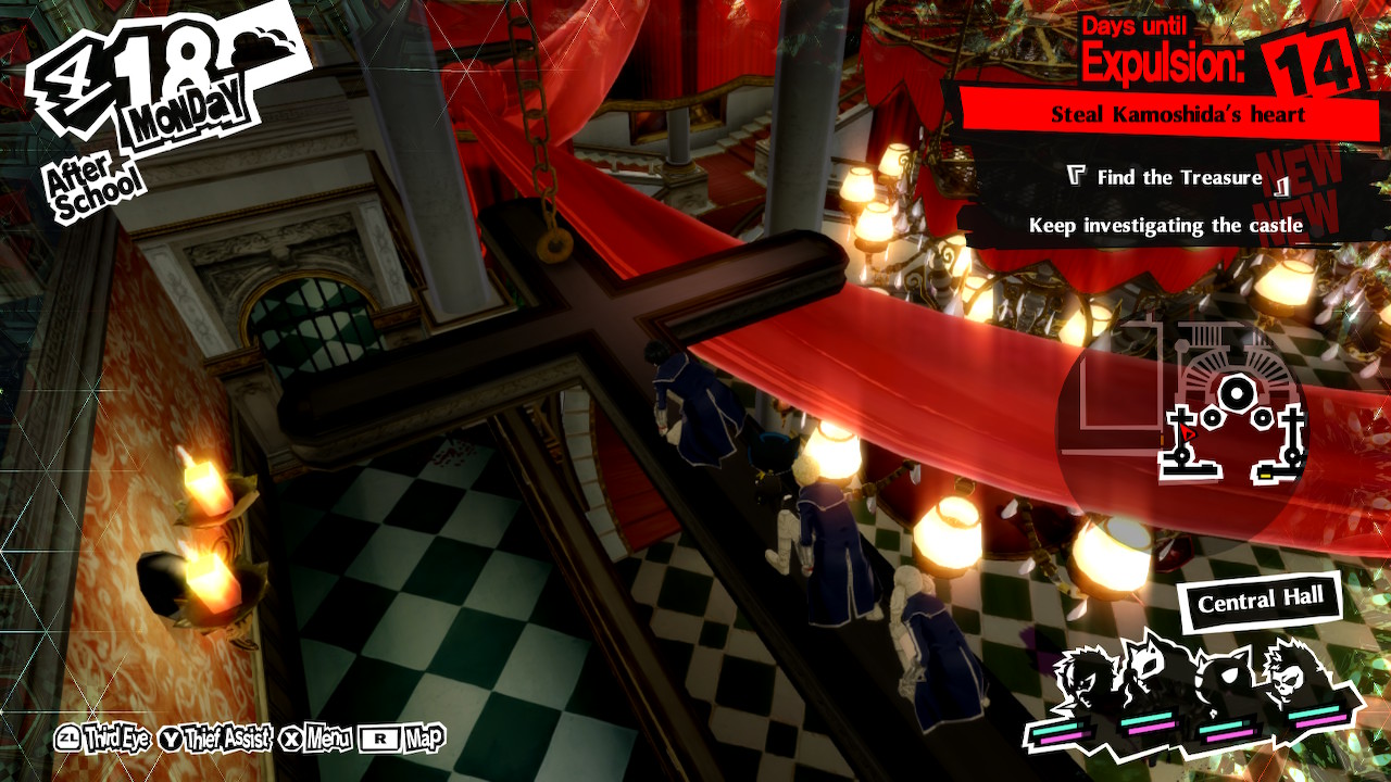 Το κάθε παλάτι είναι, πρακτικά, ο κόσμος που έχει στο μυαλό του κάθε άνθρωπος – οι επιθυμίες του. Οι εχθροί δεν είναι πάντα σατανικοί παλιάνθρωποι, καθώς αρκετά συχνά υπάρχει τόσο «γκρι» όσο χρειάζεται για να βάλει τον παίκτη σε σκέψεις για το τι είναι πράγματι κακό και τι είναι μια διαφορετική άποψη. Ακόμη και άτομα με τις καλύτερες των προθέσεων, μπορούν να προβληματίσουν με τις μεθόδους τους. Σιγά-σιγά, ο Joker καταλήγει να ηγείται των Phantom Thieves, μιας παρέας ατόμων με παρόμοιες δυνάμεις επί των Personae, δίνοντας στον παίκτη τη δυνατότητα να συνθέσει μια ομάδα επιλέγοντας τρεις χαρακτήρες, οι οποίοι θα πολεμούν με στόχο να κατατροπώσουν τα διεστραμμένα μυαλά. Οι εισβολές μπορούν να ολοκληρωθούν με τη μία, αν οι Phantom Thieves βρίσκονται σε καλό επίπεδο, αλλά υπάρχει το ενδεχόμενο να κουράζονται από τις συνεχείς μάχες σε μπουντρούμια και να θέλουν να φύγουν από τον κόσμο του Metaverse για να ξεκουραστούν στον πραγματικό.
