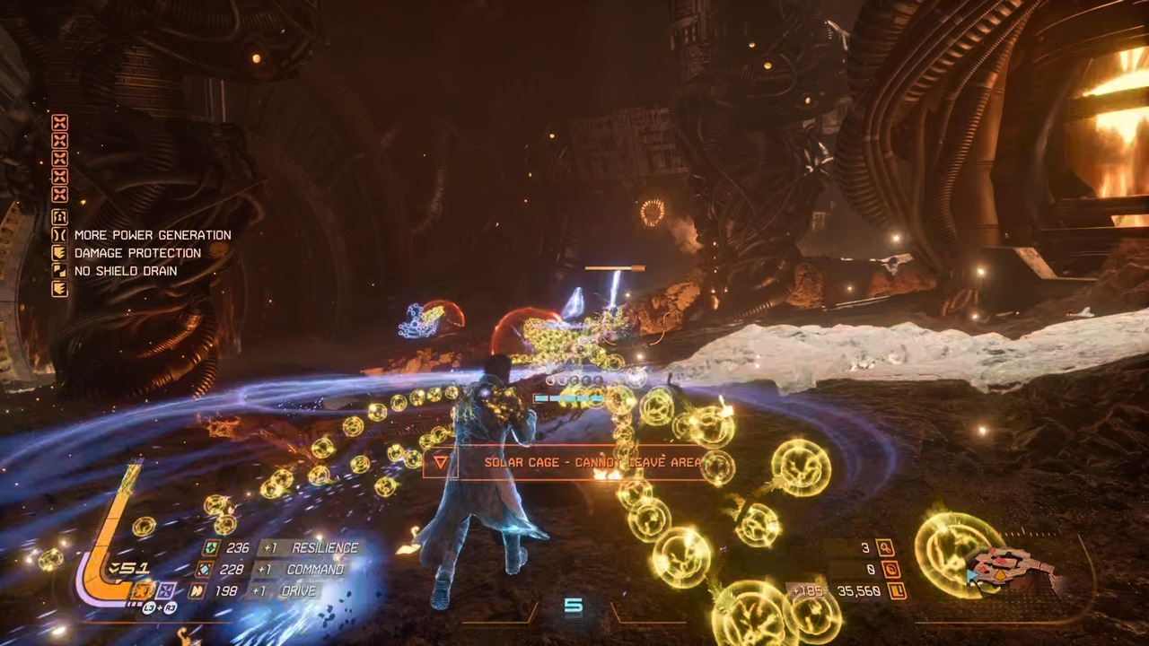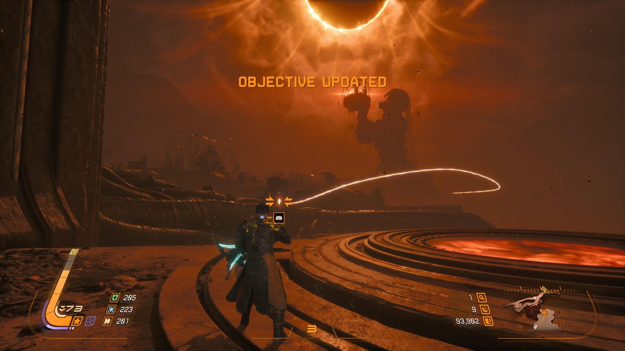 Το pacing είναι σχεδιασμένο γύρω από μικρά “cycles”(runs), όπως τα λέει το Saros. Οκτώ biomes(περιοχές), περίπου 30 λεπτά το καθένα. Στη μέση κάθε biome, ο Arjun προκαλεί έκλειψη ηλίου, αλλάζοντας δραματικά το περιβάλλον, με απόκοσμα πλοκάμια να εμφανίζονται από τοίχους και πατώματα, τα χρώματα και το τοπίο αλλάζει και η δυσκολία αυξάνεται. Οι εχθροί γίνονται πιο επιθετικοί, πιο πολλοί και αποκτούν νέες επιθέσεις. Η κορύφωση έρχεται με το boss, τον Overlord, ο οποίος είναι το πιο δυνατό εμπόδιο του Arjun στο εκάστοτε biome. Μετά από κάθε boss, έχετε επιλογή: επιστροφή στη βάση ή συνέχεια. Αν επιστρέψετε, τελειώνει το run, χάνετε stats και proficiency αλλά κρατάτε όλα τα Lumenite. Αν πεθάνετε, χάνετε τα μισά. Το σύστημα αυτό σας βάζει συνεχώς σε δίλημμα. Ρισκάρετε για περισσότερο κέρδος ή παίζετε συντηρητικά; Και αυτό είναι από τα πιο επιτυχημένα στοιχεία του design.