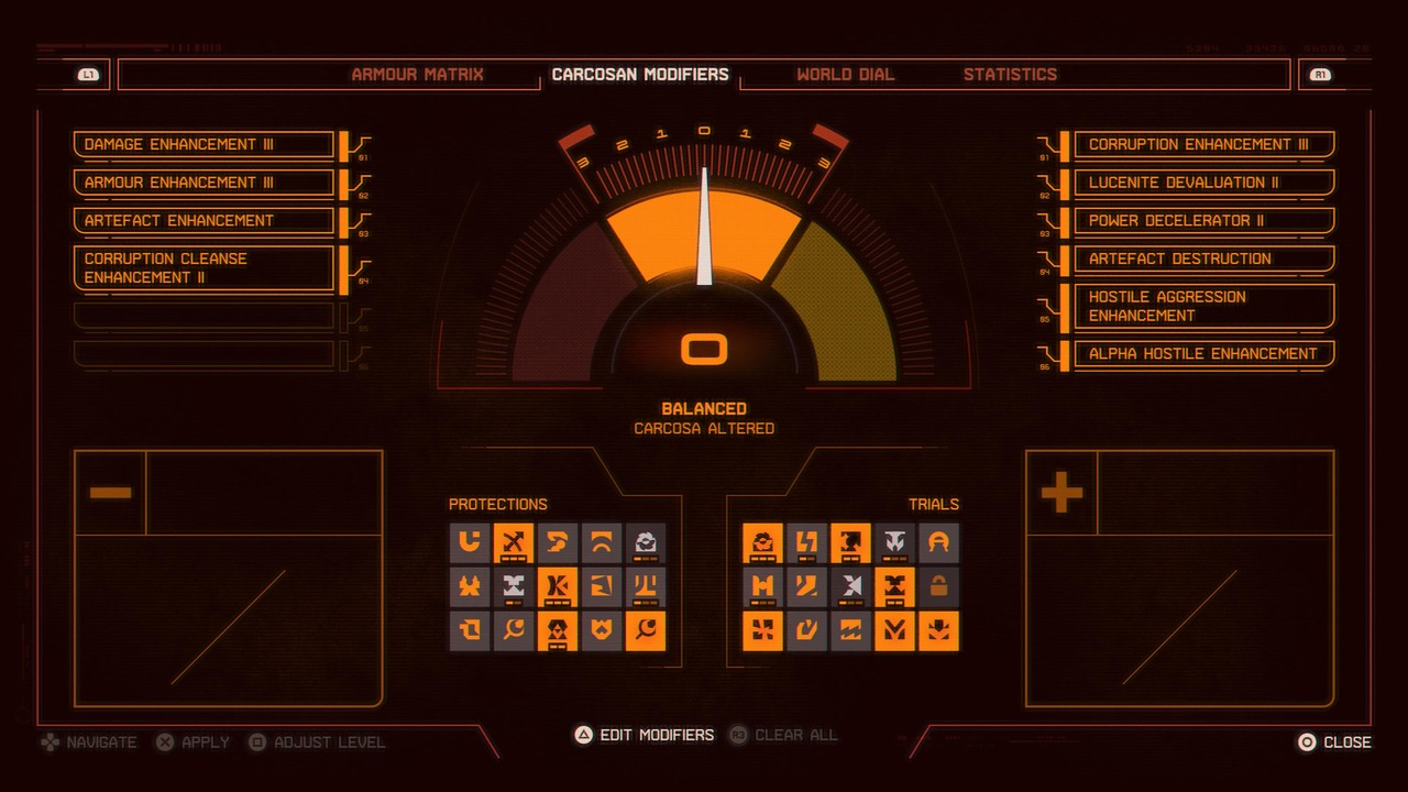 Η Housemarque έκανε και κάτι ακόμη σωστό: έριξε τη δυσκολία σε πιο προσβάσιμα επίπεδα. Δεν είναι οτι το Saros είναι απλή βολτίτσα στην παιδική χαρά, θα σας δυσκολέψει, αλλά σε καμία απολύτως περίπτωση δεν μπορεί να συγκριθεί με την δυσκολία του Returnal. Η δυσκολία του τίτλου έχει ρυθμιστεί για να λειτουργεί ισορροπημένα μέσα σε αυτά τα 30 λεπτά του κύκλου. Αν επιλέξετε να ξεκινήσετε απο το πρώτο Biome και να φτάσετε μέχρι το τελευταίο, δηλαδή να κάνετε έναν κύκλο τρεις ώρες, δεδομένου οτι θα έχετε επιβιώσει μέχρι τότε, δεν θα υπάρχει τίποτα απολύτως που να μπορεί να σταματήσει τον Arjun. Το λεγόμενο "power creep" είναι αληθινό και εκεί είναι που θα αισθανθείτε απόλυτα πως είστε ο αρμαγεδδών του πλανήτη Carcosa. Το οποίο είναι πολύ, ΠΟΛΥ ψυχαγωγικό. Για όσους προτιμούν προσαρμογή της δυσκολίας, το παιχνίδι σας προσφέρει 32 modifiers. 16 κάνουν το παιχνίδι πιο εύκολο, 16 πιο δύσκολο. Μπορείτε να φτιάξετε την εμπειρία σας ακριβώς εκεί που νιώθετε πιο άνετα. Πιο κοντά στο Returnal, πιο χαλαρή ή κάτι ενδιάμεσο.