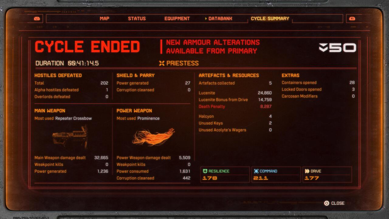 Το σύστημα προόδου είναι αυτό που κρατάει το παιχνίδι εθιστικό. Τα stats Resilience (Max Health), Command(Power weapons) και Drive(Ποσότητα Lumenite) επηρεάζουν άμεσα τον τρόπο που εξελίσσεται το κάθε run. Το Proficiency λειτουργεί ως level και ανεβαίνει όσο παίζετε, δυναμώνοντας τα όπλα σας,ενώ τα Artifacts δίνουν passive boosts που μπορούν να αλλάξουν δραματικά το build σας. Όσο πιο πολύ επιβιώνετε, τόσο πιο δυνατοί γίνεστε. Και αυτό δεν είναι απλά θεωρία. Το νιώθετε. Σε σημείο που το παιχνίδι αλλάζει ρόλους. Από το να προσπαθείτε να επιβιώσετε, φτάνετε στο σημείο να κυνηγάτε εσείς τα πάντα. Οι εχθροί αντιδρούν διαφορετικά, η πίεση μεταφέρεται από εσάς σε αυτούς και δημιουργείται μια μοναδική αίσθηση κυριαρχίας. Αυτό το power fantasy είναι από τα καλύτερα που έχουμε δει στο είδος.