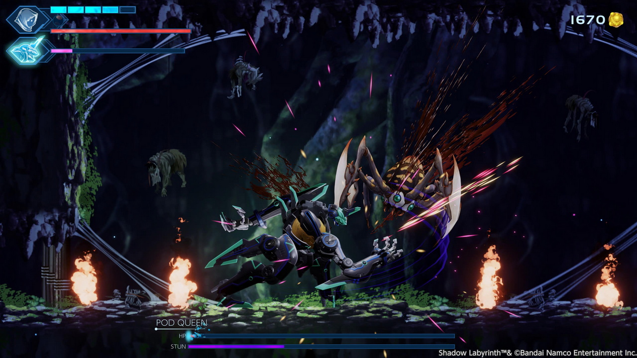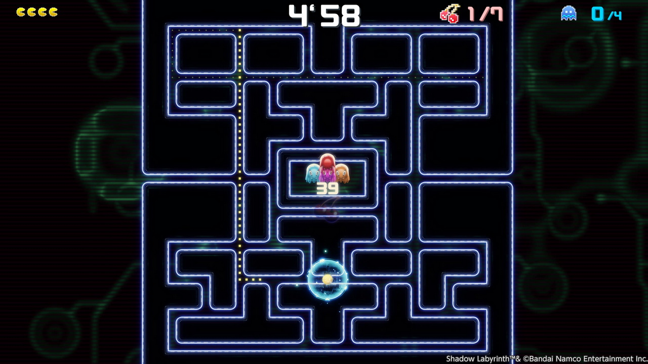 Θετική εντύπωση μας άφησε και η απουσία άδικου ή κουραστικού platforming. Ναι, υπήρξαν απαιτητικά σημεία, αλλά σε σωστή δόση και με μικρή διάρκεια. Ακόμη και τα insta-death τμήματα διαχειρίζονται καλά, με κοντινά respawn points. Αν χαθεί όμως όλη η ενέργεια, επιστρέφουμε στο πλησιέστερο checkpoint. Μιλώντας για δυσκολία, ιδιαίτερη αναφορά αξίζει στις πίστες όπου ελέγχουμε εξ ολοκλήρου τον Pac-Man, καθώς ήταν από τις πιο απαιτητικές, ειδικά όταν κυνηγούσαμε flawless ολοκλήρωση. Παρόλο που στο βασικό gameplay ελέγχουμε τον Swordsman No. 8, ο Puck –μια σκιερή και καλογραμμένη εκδοχή του Pac-Man– μας συνοδεύει παθητικά, έως ότου ξεκλειδωθούν περιοχές όπου μπορούμε να μεταμορφωθούμε σε Pac-Man. Μόλις συναντήσουμε τα στενά σημεία με τις μεταλλικές ράγες μεταμορφωνόμαστε σε Pac-Man, με τον χειρισμό να είναι γνώριμος στους fans του κλασικού χαρακτήρα. Πέρα από αυτά τα σημεία, υπάρχουν τα Mazes, που θα μπορούσαν να χαρακτηριστούν ως χαμένες πίστες της σειράς Pac-Man Championship Edition και οι οποίες λειτουργούν σαν έντονα time trials. Από την μία είναι πολύ περίεργο να βλέπει κανείς αυτές τις πίστες να ξεπετάγονται μέσα σε αυτόν τον κόσμο, από την άλλη κοιτώντας και αναλύοντας το Shadow Labyrinth με μία meta ματιά, κάπως βγάζει νόημα όλο αυτό. Μη μας ρωτάτε πώς, για κάποιον λόγο αυτή η τοποθέτηση του Pac-Man σ’ έναν εντελώς διαφορετικό κόσμο λειτουργεί, τουλάχιστον οπτικοακουστικά.