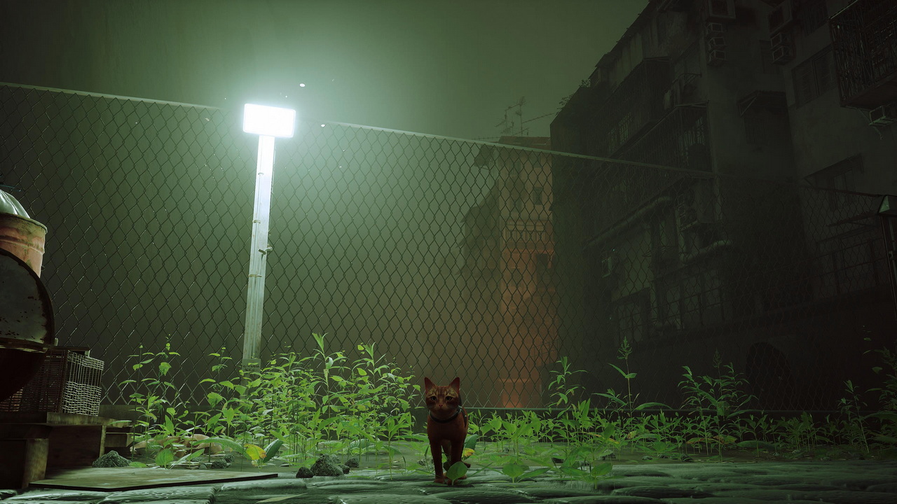 Το Stray καταπιάνεται με την περιπέτεια μίας γλυκύτατης γάτας σ’ έναν σκοτεινό κόσμο γεμάτο από άλυτα μυστήρια, εχθρούς και διάφορα χαρακτηριστικά που μιλούν στην καρδιά των γατόφιλων. Ο χρήστης ξεκινάει από το πρώτο κιόλας λεπτό να χειρίζεται μία γάτα σ’ έναν κόσμο χωρίς ανθρώπους και έντονο το φυσικό στοιχείο, θυμίζοντας λίγο τον έξω κόσμο του The Last of Us σαν setting. Η post apocalyptic αύρα γίνεται όλο και πιο έντονη και αλλάζει σε μεγάλο βαθμό, καθώς η γάτα πέφτει σ’ ένα κενό, με αποτέλεσμα να χωριστεί από τις υπόλοιπες γάτες και να βρεθεί σ’ ένα σκοτεινό και βροχερό περιβάλλον το οποίο κατοικείται κυρίως από ένα είδος ρομπότ-droids. Η ατμοσφαιρική ηλεκτρονική μουσική μας μεταφέρει με εξαιρετικό τρόπο στην ιστορία και το περιβάλλον μίας ξεχασμένης πόλης που βγάζει έντονα vibes από Blade Runner, αλλά και λίγο Walled City από Shenmue 2, παρακολουθώντας μία cybercity με έντονα neon lights και μπόλικο σκοτάδι. Αν και δεν υπάρχουν κάποια αξιομνημόνευτα κομμάτια, η μουσική είναι όμορφη και ταιριάζει σε απόλυτο βαθμό με τον τίτλο, με σωστές αυξομειώσεις σε ένταση και διάρκεια χωρίς να καπελώνει ποτέ την ατμόσφαιρα του παιχνιδιού, ενώ τα sound effects των ήχων στο περιβάλλον είναι καταπληκτικά.
