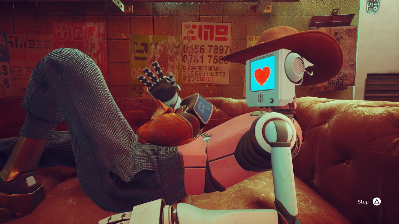 Όλη αυτή ατμόσφαιρα βέβαια δε θα μπορούσε να ξεκινήσει έτσι πετυχημένα, εάν δεν υπήρχε ένας εξαίρετος οπτικός τομέας με πανέμορφη HDR εικόνα για να υποστηρίξει το εγχείρημα με τον καλύτερο δυνατό τρόπο. Με εξαίρεση ένα συγκεκριμένο δωμάτιο όπου αντιμετωπίσαμε ισχυρό stuttering και πάγωμα της εικόνας, ο τίτλος έτρεχε σ’ όλα τα σημεία απροβλημάτιστα. Το Stray μπορεί να μην είναι ένα νέο Horizon: Forbidden West από άποψη γραφικών, άλλα αυτό που είδαμε ξεπέρασε τις προσδοκίες μας ή τις προβλέψεις που κάναμε επειδή επρόκειτο για έναν indie τίτλο. Πολλά χρώματα, αφίσες, βαμμένοι τοίχοι, δωμάτια με μπόλικα πράγματα ως ντεκόρ, τα οποία αποτελούν μία πρώτης τάξεως ευκαιρία για να πεταχτούν στο πάτωμα από μία ζημιάρα γάτα. Οι χρήστες μπορούν να ρίξουν από τα τραπέζια και τις οροφές των κτηρίων σχεδόν τα πάντα ελέγχοντας την πανέμορφη τιγρέ γάτα, όπως και φυσικά μπορούν να επιλέξουν απλώς να κοιμηθούν σε κάποια ζεστή γωνίτσα. Η BlueTwelve Studio φαίνεται ότι τρέφει ιδιαίτερα συναισθήματα για τις γάτες και δημιούργησε μία digital έκδοση μίας αξιολάτρευτης γάτας με ομοιόμορφες κινήσεις, πετυχημένα physics και μπόλικα εξτραδάκια που αναδεικνύουν τα στοιχεία που αγαπήσαμε στο DualSense. Πέρα από το haptic feedback και τις δονήσεις που προέρχονται από τις κινήσεις της γάτας, ο χρήστης μπορεί να ακούει τα νιαούρισματα και διάφορους άλλους ήχους μέσα από το χειριστήριο, ή κυριολεκτικά να νιώθει το ροχαλητό-γουργούρισμά της ή την στιγμή που πίνει νερό με την γλώσσα της από κάποιο τυχαίο σημείο της πόλης. Μπορεί αυτά τα στοιχεία να μη φαντάζουν ικανά να αλλάξουν το παιχνίδι σε γιγάντιο βαθμό, αλλά αποτελούν τις μικρές λεπτομέρειες που θα ωθήσουν το παίκτη να αγκαλιάσει το όλο εγχείρημα πιο γρήγορα, καθώς εξερευνεί την πόλη γρατζουνώντας καναπέδες και χαλιά χωρίς ιδιαίτερο λόγο.