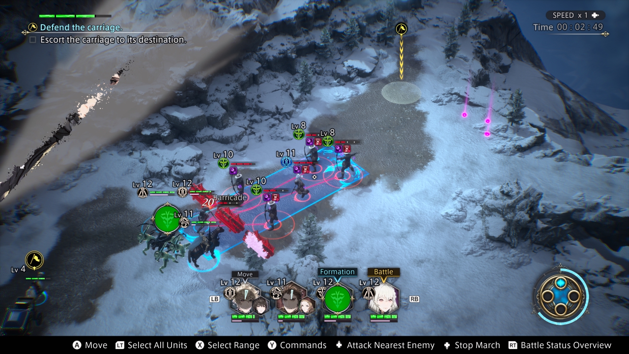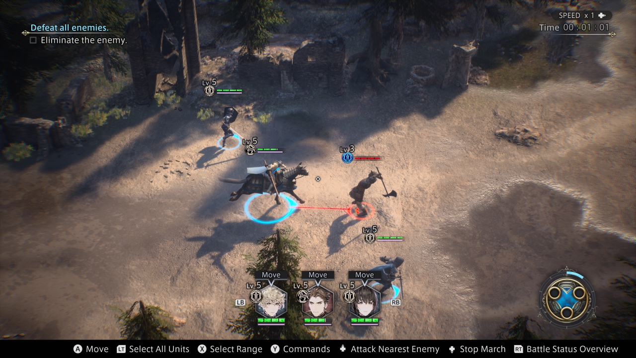 Η κάμερα βρίσκεται ψηλά και κοιτάζει προς τα κάτω υπό γωνία, με τον παίκτη να έχει υπό τον έλεγχό του πολλές μονάδες στρατιωτών τις οποίες διατάζει και κινεί σε πραγματικό χρόνο πάνω στις πίστες. Είναι μια πολύ ενδιαφέρουσα προσέγγιση που κρατάει την αμεσότητα ενός παιχνιδιού στρατηγικής πραγματικού χρόνου χωρίς τη διαχείριση μεγάλων στρατών, κτηρίων κλπ που συχνά απαιτεί το είδος – περισσότερα παρακάτω. Εξίσου σημαντικό ρόλο παίζει και η εισαγωγή στοιχείων RPG στο μίγμα, αφού ο παίκτης μπορεί να εξοπλίσει τους στρατιώτες με όπλα και αξεσουάρ, με τα τελευταία να επηρεάζουν διάφορα στατιστικά (από την άμυνα έως την επίθεση ή το HP). Οι χαρακτήρες ανήκουν σε μία από τέσσερις κλάσεις: Soldier, Cavalier, Sharpshooter, Magicker. Αντίστοιχα, πρόκειται για ιππότες, ιππείς, τοξότες και μάγους, με κάθε κλάση να διαθέτει ένα skill tree που ο παίκτης μπορεί να εξελίξει μέσω πόντων που συγκεντρώνει από τις αποστολές.