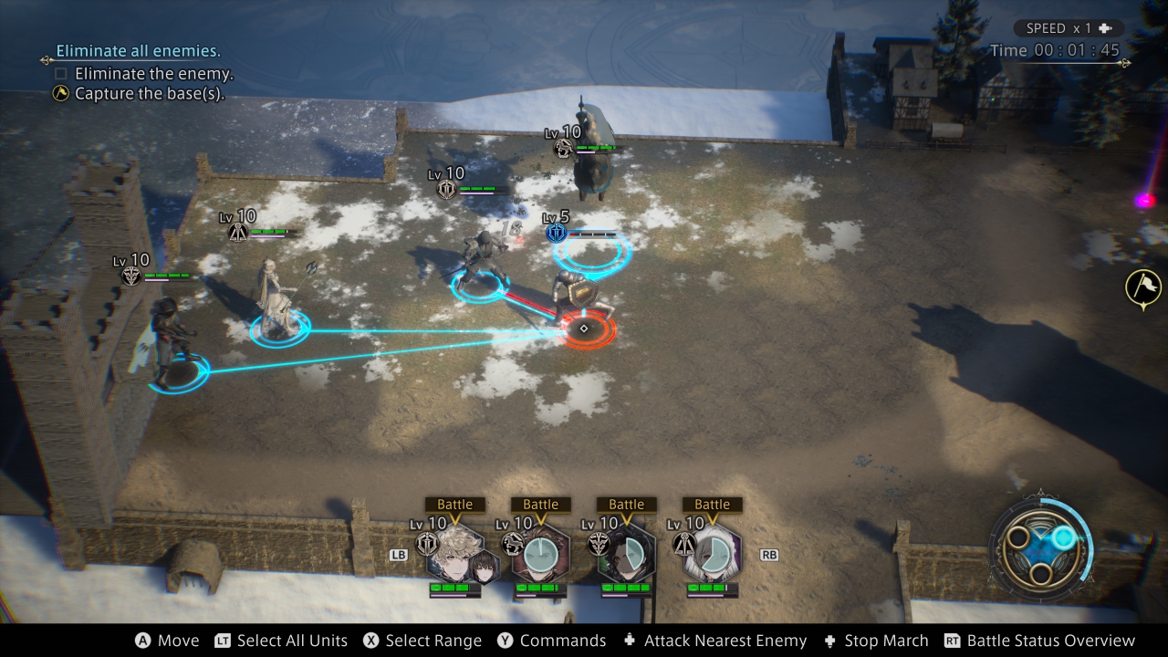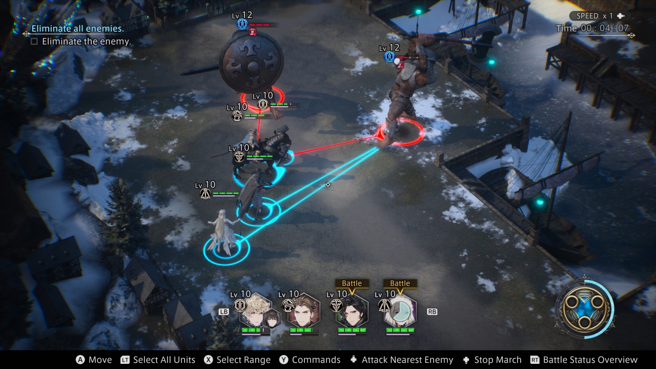 Οι απλές επιθέσεις των χαρακτήρων δεν πρέπει να υποτιμούνται, αφού μπορούν να αποβούν μοιραίες και το σύστημα μάχης βοηθάει πολύ σε αυτό. Οι πισώπλατες επιθέσεις κάνουν περισσότερη ζημιά, οπότε ο παίκτης θα πρέπει να τοποθετεί με τέτοιο τρόπο τις μονάδες του ώστε οι ισχυρότεροι να εκμεταλλεύονται τις πλάτες των εχθρών, κάτι που δεν είναι πάντα εύκολο δεδομένου ότι οι εχθροί μπορεί να έρχονται από παντού κι ο χρόνος δεν σταματάει. Οι μοναδικές στιγμές που ο χρόνος παγώνει είναι όταν ο παίκτης ανοίγει το μενού για να επιλέξει μια κίνηση (οι απλές επιθέσεις γίνονται αυτόματα), να χρησιμοποιήσει ένα αντικείμενο κλπ. Όταν ο χρόνος είναι παγωμένος, μπορεί επίσης να ορίσει ένα μονοπάτι τριών σημείων για τον κάθε χαρακτήρα, ώστε να τους φέρει ακριβώς εκεί που θέλει. Κάτι τέτοιο είναι χρήσιμο όχι μόνο για επίθεση, αλλά και για άμυνα, αφού οι εχθροί μπορεί να κάνουν επιθέσεις μεγάλης κλίμακας και ο κάθε χαρακτήρας να πρέπει να ξεφύγει από αλλού. Υπάρχουν και πλήκτρα για μαζική επιλογή όλων ή μερικών χαρακτήρων κι επίσης η κίνηση δεν είναι απαραίτητο να γίνεται επιλέγοντας τρία σημεία – αν επιλεχθεί ένα, τότε απλώς θα μεταβούν προς εκεί χωρίς ενδιάμεσες στάσεις.