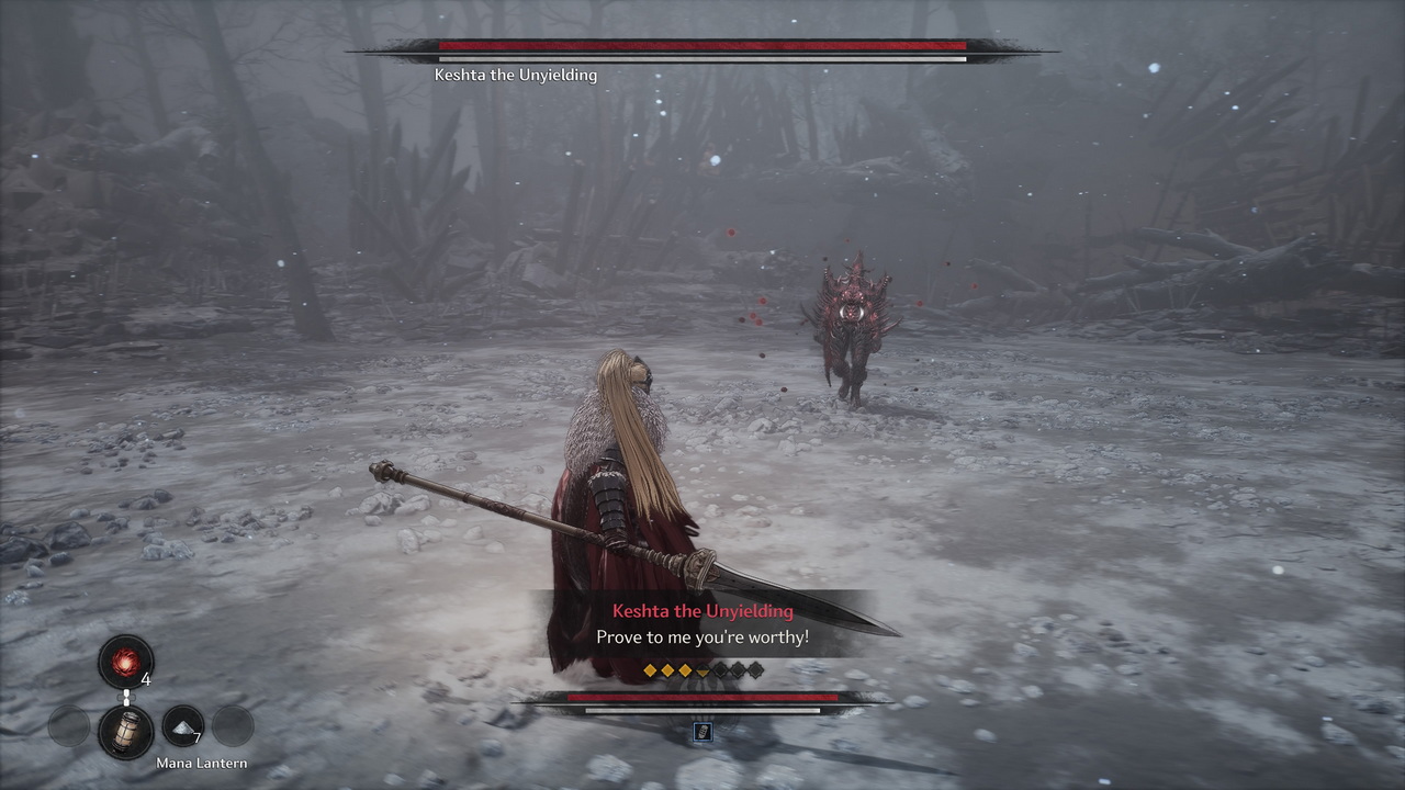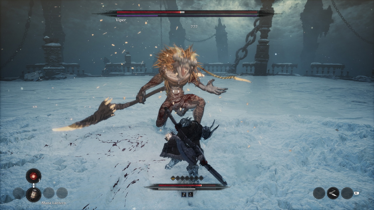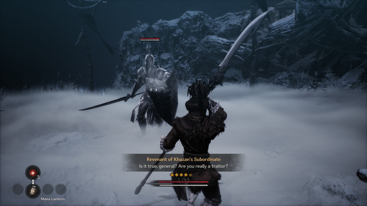 Τα bosses του Khazan είναι άκρως απαιτητικά και μάλιστα από την αρχή. Μέσα στις πρώτες τρεις ώρες του παιχνιδιού θα χρειαστεί να αντιμετωπίσουμε boss που σε άλλον τίτλο της κατηγορίας, θα το βρίσκαμε κοντά στο endgame. Τα bosses, επιβλητικά και πανέμορφα σχεδιασμένα, φέρουν έξυπνα movesets που δοκιμάζουν αντανακλαστικά και υπομονή, χρήζουν προσεκτικής διαχείρισης stamina και αντικειμένων και αναγκάζουν σε πολλαπλές προσπάθειες. Πολλά από αυτά εκτελούν combos που μοιάζουν να μην έχουν σταματημό, αφήνοντας απειροελάχιστα περιθώρια αντίδρασης πέρα από άψογα deflections υπό τεράστια πίεση. Στις περισσότερες περιπτώσεις μπορούμε να κάνουμε summon NPCs για βοήθεια – το Spirit of Advocacy – αλλά σχεδόν πάντα πεθαίνουν σε λιγότερο από ένα λεπτό. Μάλιστα, για να μπορούμε να τα κάνουμε summon χρειάζεται farming ενός ειδικού αντικειμένου, που έρχεται ως επιβράβευση στη νίκη επί των “κακών” summons που υπάρχουν διάσπαρτα στον κόσμο. Πρόκειται για NPCs – mini-bosses που φέρουν και σπάνιο loot, αλλά και περισσότερο Lacrima από τους κοινούς εχθρούς του παιχνιδιού. Lacrima είναι τα αντίστοιχα Souls που συμβάλλουν στο leveling up του χαρακτήρα μας και που, εκτός από τις μάχες, μπορούν να αλιευτούν και από αντικείμενα που δε θέλουμε ούτε να χρησιμοποιήσουμε, ούτε και να πουλήσουμε. Όσο για τα εν λόγω mini-bosses, λειτουργούν μονάχα ως εργαλείο farming, αφού φέρουν σχεδόν πάντα μονότονα movesets και ελάχιστο stamina. Τα bosses από τη μεριά τους, παρότι καλοσχεδιασμένα, επαναλαμβάνονται σε μεγάλο βαθμό που πιθανότατα θα μπορούσε να αποφευχθεί με τη μείωση του αριθμού τους.