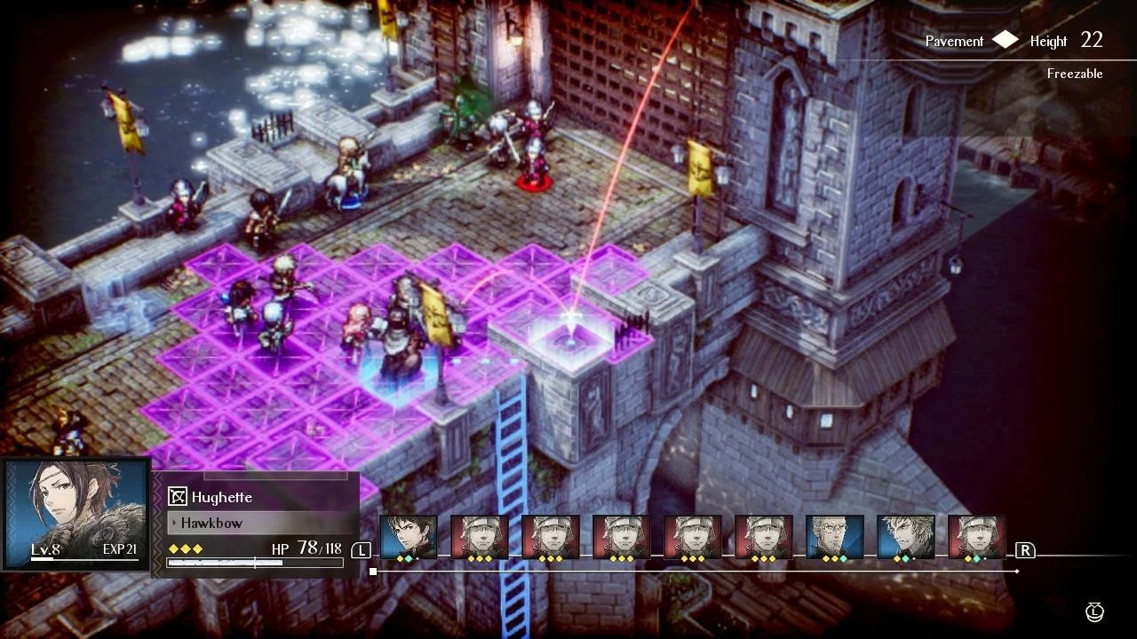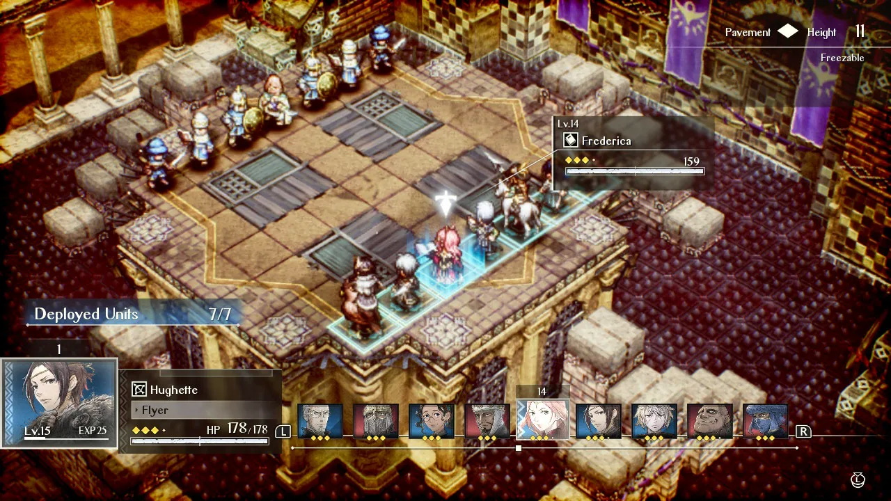 Ένα ακόμα ενδιαφέρον στοιχείο του Triangle Strategy είναι ο τρόπος με τον οποίο το παιχνίδι σας “βοηθάει” να οργανώσετε την επίθεσή σας. Όταν έρθει η σειρά σας και πρέπει να μετακινήσετε έναν χαρακτήρα τότε το πεδίο μάχης φωτίζεται με διαφορετικά χρώματα ώστε να σας κατατοπίσει. Όπου βλέπετε μπλε χρώμα είναι τα τετράγωνα στα οποία είστε ασφαλής. Όπου είναι μωβ τα τετράγωνα στα οποία μπορεί να δεχθείτε ζημιά από τον αντίπαλο, δηλαδή μπορεί να σας φτάσει με την επίθεσή του. Η κάμερα σας επιτρέπει να δείτε από όποια πλευρά θέλετε το πεδίο σύγκρουσης, ώστε να έχετε καλύτερη ορατότητα και να πάρετε πιο σωστή απόφαση. Στο roster σας θα υπάρχουν αρχικά συγκεκριμένοι ήρωες για να επιλέξετε, αργότερα όμως μπορείτε να επανδρώσετε τον στρατό σας με πολλούς και διαφορετικούς, εμπλουτίζοντας ποιοτικά την ομάδα σας. Γενικά λοιπόν το σύστημα μάχης του Triangle Strategy παρομοιάζεται με μία ιδιαίτερη παρτίδα σκακιού στην οποία όλοι -σχεδόν- έχουν ιδιαίτερες κινήσεις και χρειάζεται αρκετή σκέψη και θυσίες προκειμένου να νικήσετε. Αξίζει να σημειώσουμε σε αυτό το σημείο πως νίκη δεν σημαίνει απαραίτητα να εξαφανίσετε όλες τις μονάδες του αντίπαλου στρατού από τον χάρτη. Πριν ξεκινήσετε την μάχη αναφέρονται οι συνθήκες με τις οποίες μπορείτε να βγείτε νικητές.