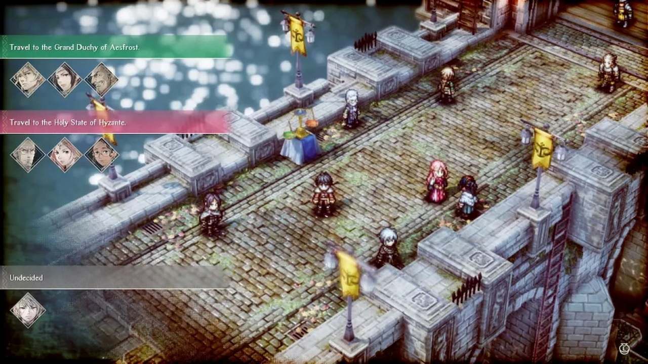 Πέραν των επιθέσεων και των συγκρούσεων το παιχνίδι αφήνει περιορισμένο έδαφος για εξερεύνηση. Πρόκειται για πολύ μικρούς χάρτες, μικρά χωριά με τέσσερα- πέντε σπιτάκια, μία αυλή ενός παλατιού ή ένα δωμάτιο, στα οποία ο Serenoa μπορεί να κινηθεί ελεύθερα, να μιλήσει στους NPCs και να ανακαλύψει αντικείμενα – κάποια με πολύ σημαντικό όφελος για την εξέλιξη της ιστορίας. To παιχνίδι χωρίζετε σε chapters και κάθε ένα από αυτά χωρίζεται εξίσου σε μικρότερα τμήματα. Πριν ξεκινήσει κάποιο cutscene τότε εμφανίζεται ένας κεντρικός χάρτης ο οποίος δείχνει τα τρία βασίλεια και από κάτω υπάρχει μια αφήγηση. Ό,τι εμφανίζεται με κόκκινο χρώμα είναι κομμάτι της κεντρικής ιστορίας, ενώ ό,τι εμφανίζεται με πράσινο είναι side quest. Εαν δεν βιάζεστε καλό είναι να κάνετε και μερικά side-quests γιατί δίνουν μία καλύτερη εικόνα της Norzelia, του ιστορικού υποβάθρου της και ταυτόχρονα σας δίνει μία ευκαιρία να εμβαθύνετε στην προσωπικότητα των πρωταγωνιστών. Πέρα από αυτά, προτού επιλέξετε την τοποθεσία του χάρτη την οποία θέλετε να επισκεφτείτε, το παιχνίδι σας ενημερώνει με εικονίδια για το τι πρόκειται να συμβεί. Έτσι εάν πρόκειται να ακολουθήσει μάχη, ή εξερεύνηση ή ψηφοφορία – στην οποία θα αναφερθούμε παρακάτω- είστε προϊδεασμένοι και επιλέγετε εάν θα προχωρήσετε ή αν θα ασχοληθείτε με κάποιο side quest. Ένας μεγάλος και διασκεδαστικός παράγοντας στο Triangle Strategy είναι οι επιλογές. Κατά την διάρκεια την αφήγησης ο πρωταγωνιστής θα έρθει αντιμέτωπος με προβλήματα, ερωτήσεις και διλλήματα στα οποία θα κληθεί να πάρει θέση. Όταν πρόκειται για πολύ σημαντικές αποφάσεις οι οποίες θα καθορίσουν την εξέλιξη της ιστορίας σε τεράστιο βαθμό, τότε στον χάρτη εμφανίζεται ένα εικονίδιο με μία ζυγαριά και ακολουθεί ψηφοφορία. Εκεί τίθεται ένα ερώτημα ζωτικής σημασίας και μπορείτε να δείτε ποια απόφαση έχουν πάρει οι σύμμαχοί σας. Τώρα είναι η στιγμή για διπλωματία. Έχετε το δικαίωμα πριν ρίξουν την ψήφο τους στην κάλπη να προσπαθήσετε να τους μεταπείσετε με τον λόγο σας. Πολλές φορές δεν θα είναι ξεκάθαρο εάν καταφέρατε να αλλάξετε γνώμη σε κάποιον χαρακτήρα, οπότε μην βρεθείτε προ εκπλήξεως εάν το αποτέλεσμα δεν ήταν το επιθυμητό.