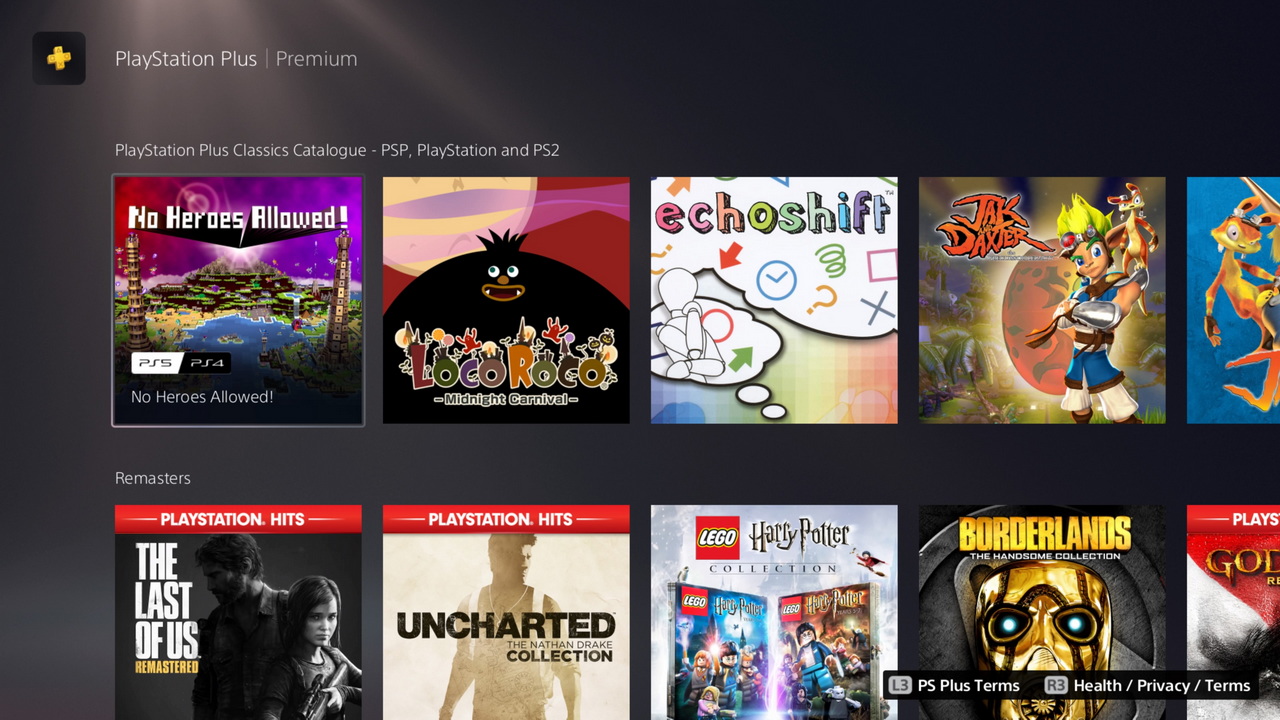 Παρέχει όλα τα προνόμια του προγράμματος PlayStation Plus Essential και επιπλέον πρόσβαση στον κατάλογο παιχνιδιών, ο οποίος περιέχει έως και 400 τίτλους των PS4 και PS5 προς λήψη, μεταξύ των οποίων: