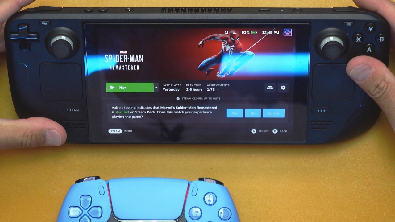 Παίζουμε το Marvel's Spider-Man Remastered για υπολογιστές στο Steam Deck της Valve σε 720p30 με medium settings.