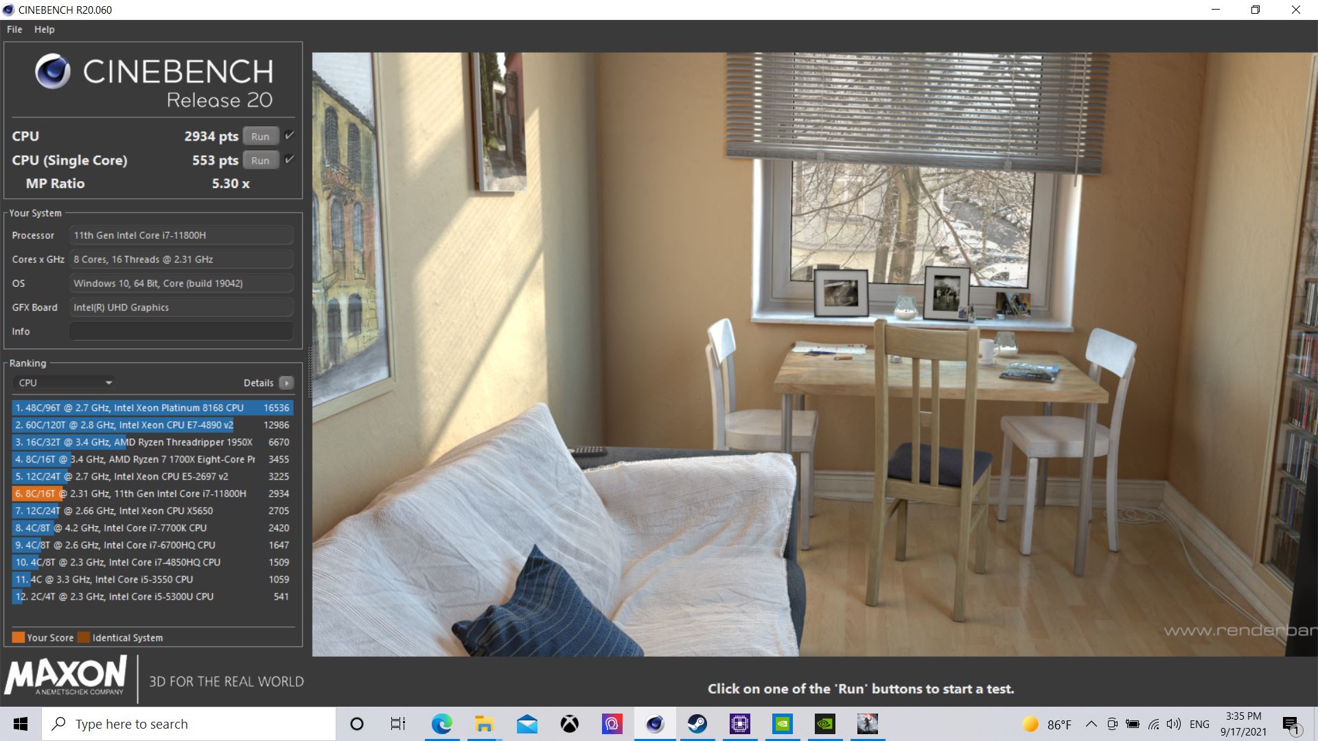 Τρέξαμε το Cinebench 20 για να δούμε τις επιδόσεις του και πήραμε σκορ 2934, με τη θερμοκρασία της CPU να βρίσκεται γύρω στους 90 βαθμούς (σε δωμάτιο με 23 βαθμούς). Σε single core run του Cinebench 20 πήραμε 553 μονάδες.