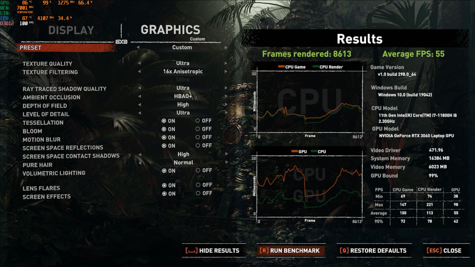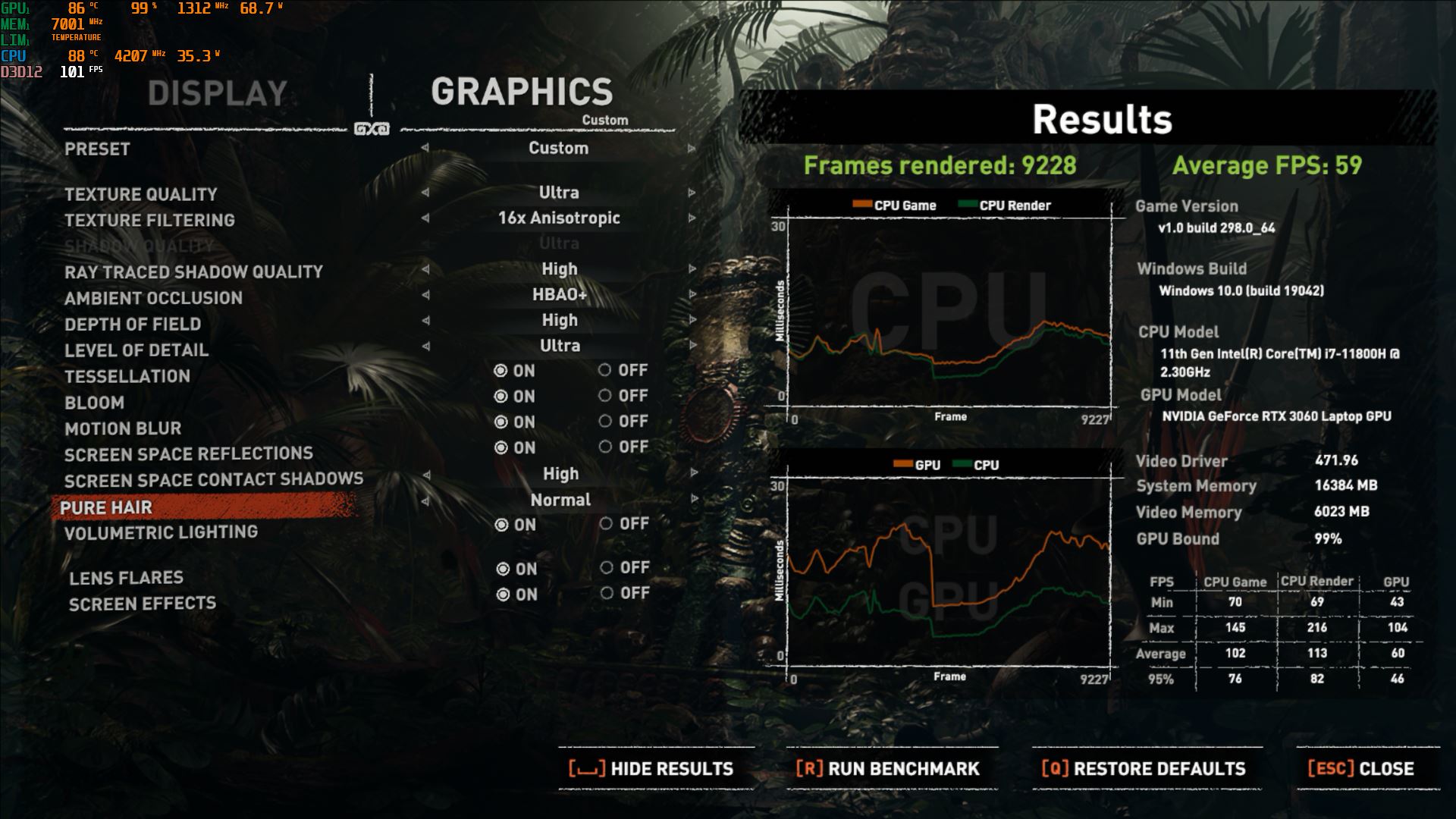 Στο Shadow of the Tomb Raider με ενεργό το ray tracing σε High και Ultra πήραμε αντίστοιχα 59 και 55fps (με ελάχιστες τιμές τα 43 και 38fps αντίστοιχα).