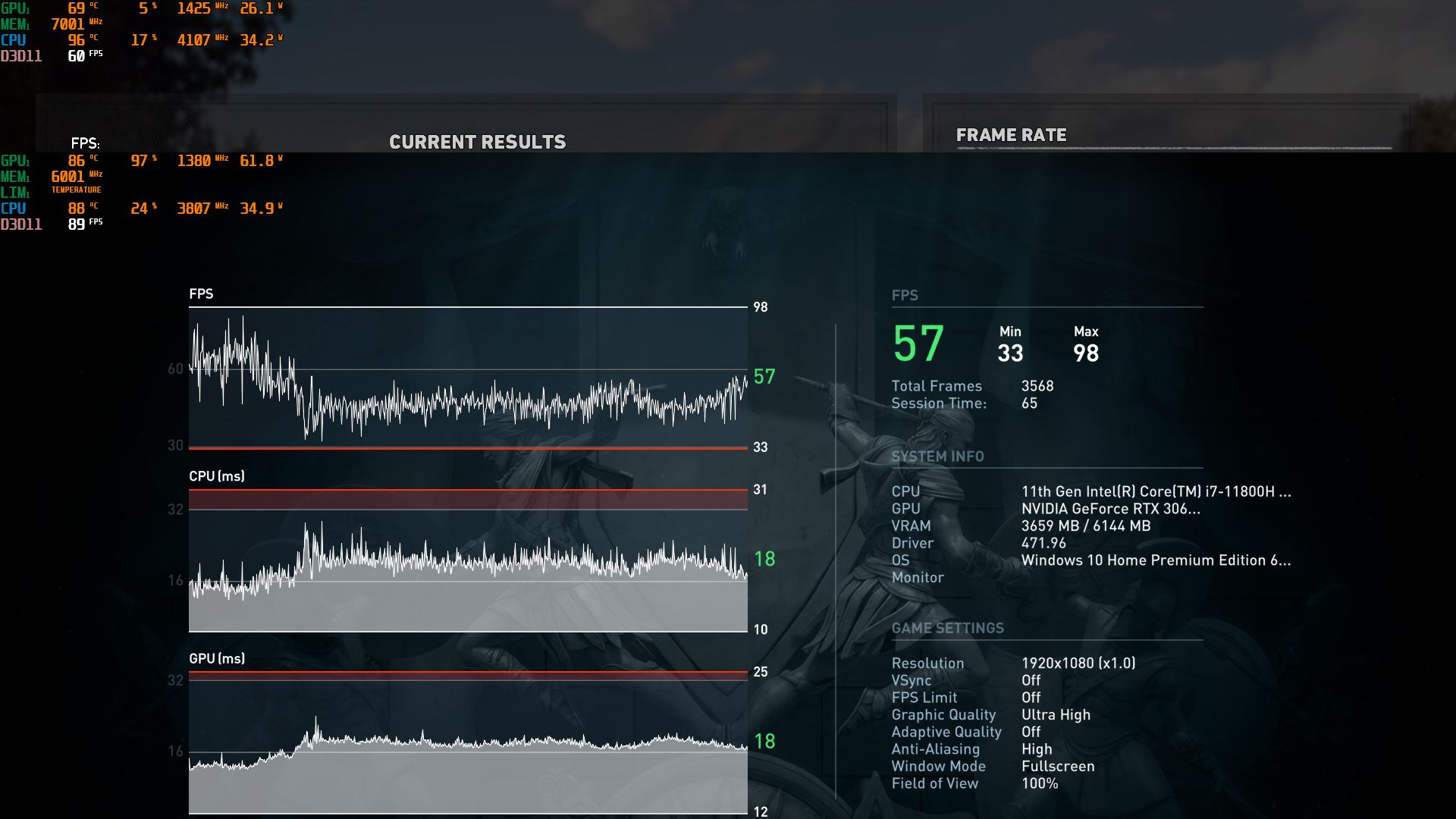 Βέβαια για τα 144fps που απαιτούνται για να παίζει κανείς με Vsync στην οθόνη, απαιτούνται αντίστοιχα ειδικές ρυθμίσεις. Πάμε όμως στα απαιτητικά παιχνίδια. Στο benchmark του Assassin's Creed Odyssey με ρύθμιση Ultra μας έδωσε 57fps (ελάχιστη τιμή τα 33fps).