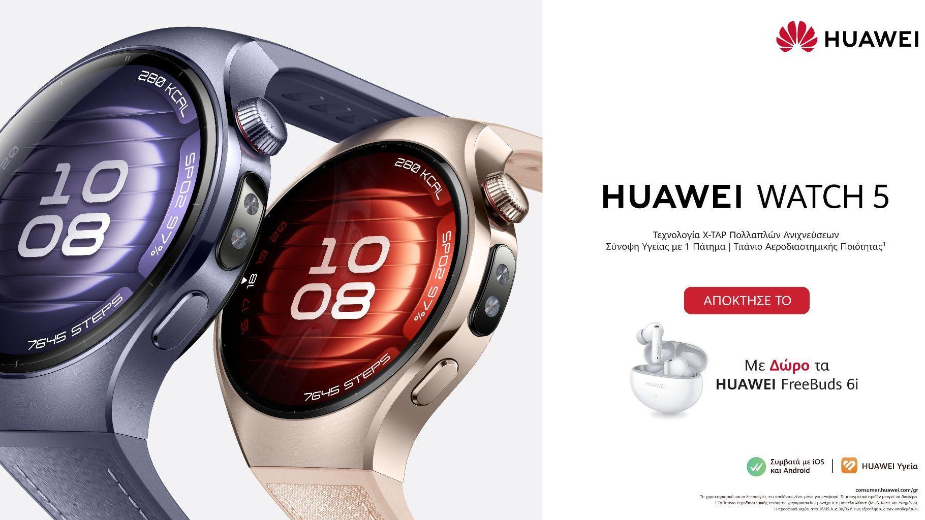 Επίσημη έναρξη πωλήσεων για τα πολυαναμενόμενα HUAWEI WATCH 5, WATCH FIT 5 Pro, και τα νέα κορυφαία ακουστικά  HUAWEI FreeBuds 6 στην ελληνική αγορά από την Δευτέρα 26 Μαΐου 2025. Με αφορμή το λανσάρισμα, η Huawei προσφέρει εντυπωσιακά δώρα που ολοκληρώνουν την εμπειρία συνδεσιμότητας και προσωπικής φροντίδας.