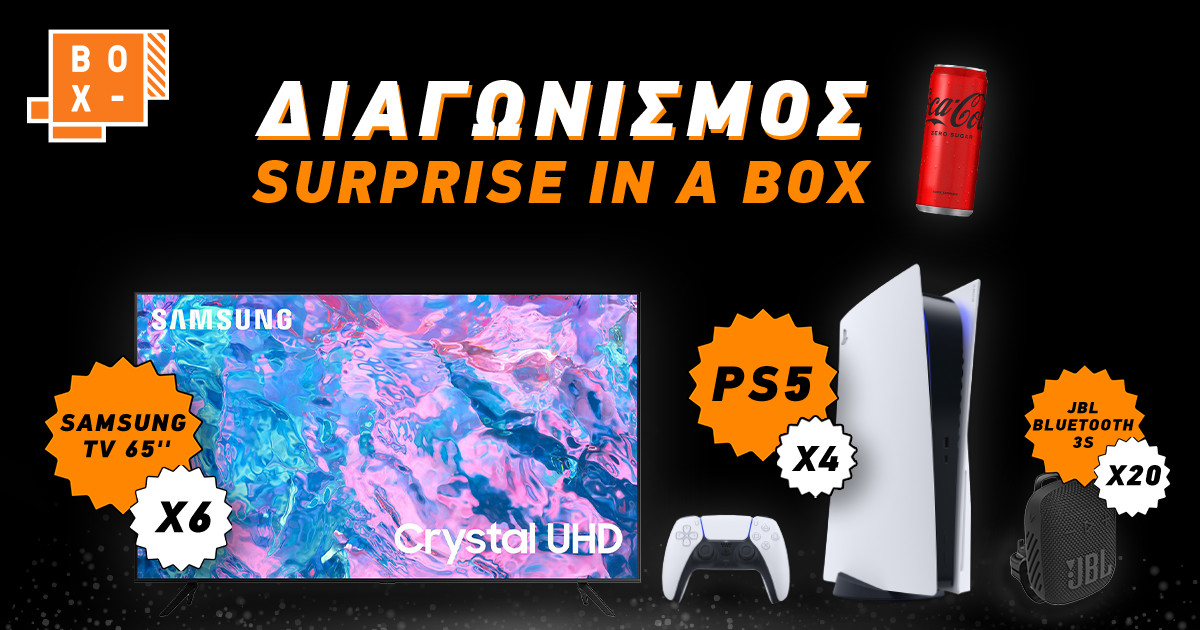 Οι 30 τυχεροί που θα αναδειχθούν έπειτα από κλήρωση, θα έχουν την ευκαιρία να κερδίσουν 6 τηλεοράσεις SAMSUNG 65" 4Κ Ultra HD’’, 4 Play Station 5 και 20 ασύρματα ηχεία JBL. Κάθε παραγγελία με προσθήκη Coca-Cola είναι και μία συμμετοχή. Συνεπώς, όσες περισσότερες είναι οι παραγγελίες, τόσες περισσότερες θα είναι και οι πιθανότητες να κερδίσουν. Ο διαγωνισμός “Surprise in a BOX” θα διαρκέσει έως και την 1η Μαρτίου και η κλήρωση θα πραγματοποιηθεί στις 4 Μαρτίου.