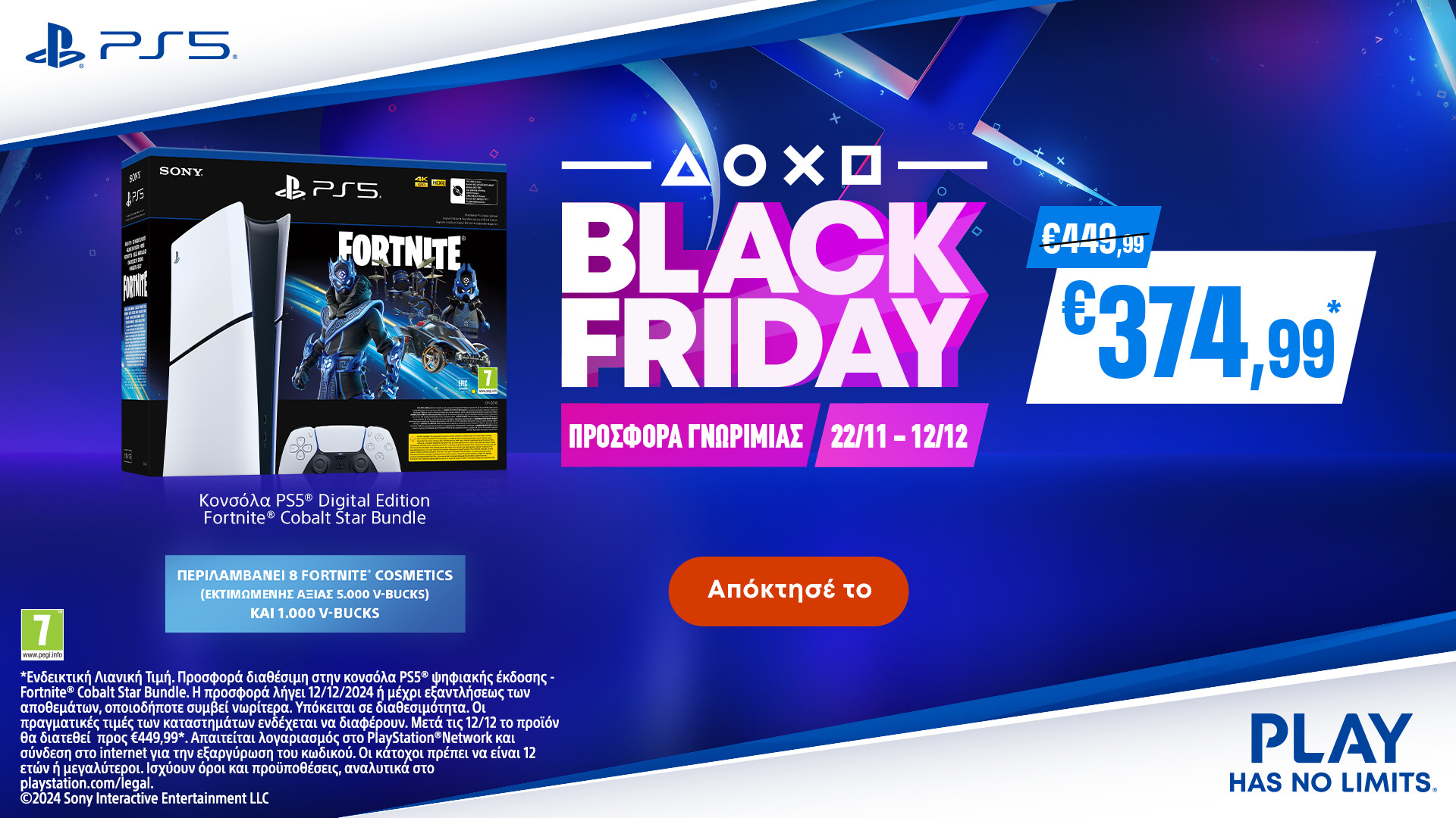 Επισκεφθείτε το PlayStation.com και περιηγηθείτε στις Black Friday προσφορές εδώ: https://www.playstation.com/el-gr/deals/black-friday/ και στο PlayStation®Store εδώ: https://store.playstation.com/en-gr/pages/BlackFriday/