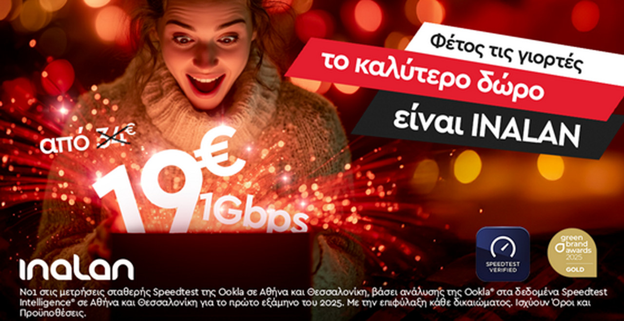 Φέτος τα Χριστούγεννα, η INALAN προσφέρει 1Gbps στα 19€ και κάνει αυτή τη σύνδεση προσιτή σε κάθε σπίτι. Γιατί η τεχνολογία αποκτά αξία μόνο όταν γίνεται γέφυρα. Και κάθε γέφυρα έχει έναν σκοπό: να φέρνει ανθρώπους πιο κοντά. Σε κάθε ευχή, σε κάθε επικοινωνία, σε κάθε στιγμή που δεν θέλουμε να χαθεί, η INALAN βρίσκεται εκεί, με μια σύνδεση δυνατή και σταθερή, που φέρνει τους ανθρώπους πραγματικά πιο κοντά.