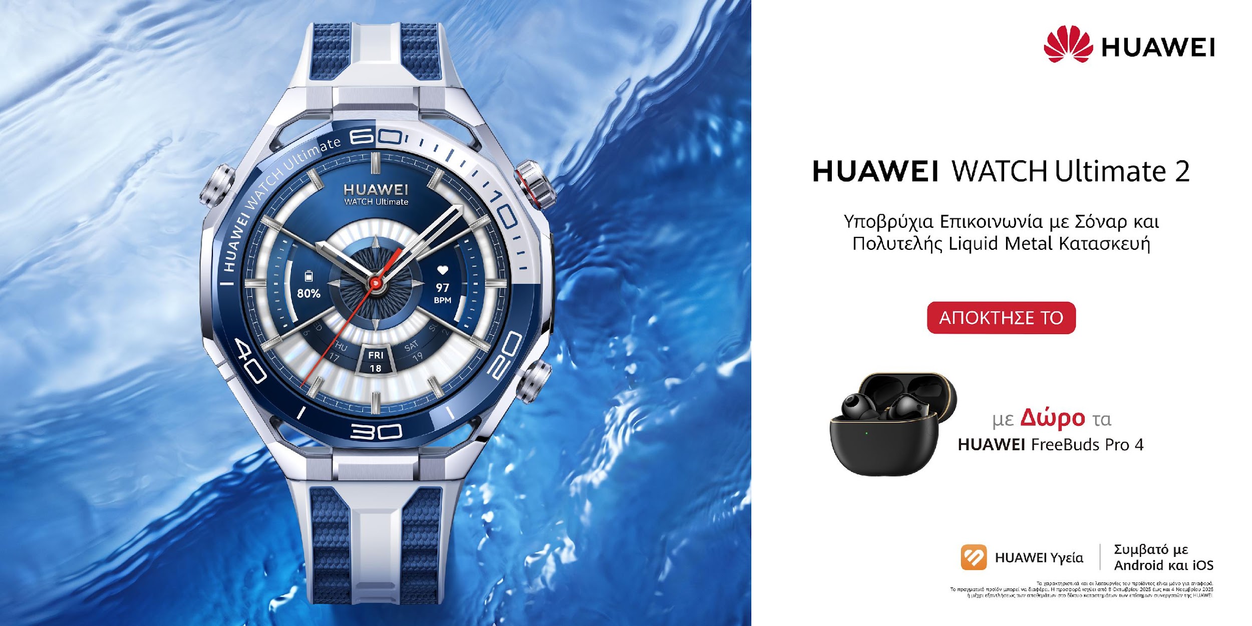 Διαθέσιμο στην Ελλάδα από 8 Οκτωβρίου 2025, είναι το HUAWEI WATCH Ultimate 2, το πρώτο smartwatch που υποστηρίζει υποβρύχια επικοινωνία με τεχνολογία sonar, προσφέροντας ασύγκριτη ασφάλεια και ευκολία στις καταδύσεις. Η συνέχεια του επιτυχημένου HUAWEI WATCH Ultimate, το Watch Ultimate 2, έρχεται με δώρο τα HUAWEI Freebuds Pro 4 με κάθε αγορά.