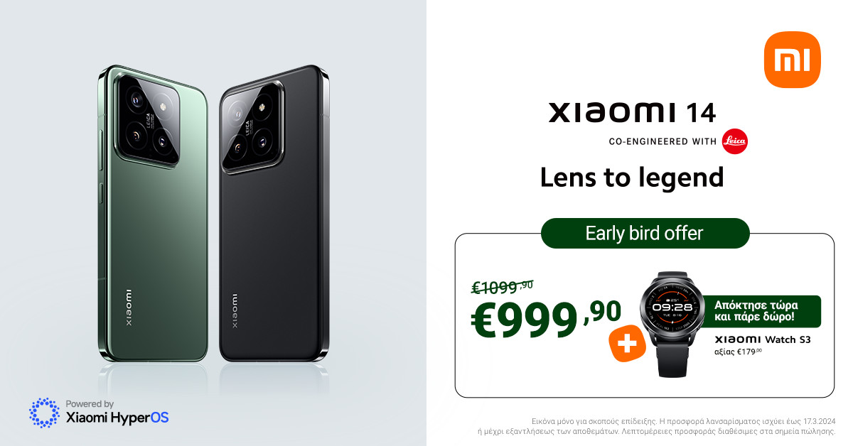 Μέχρι τις 17 Μαρτίου (ή μέχρι εξαντλήσεως των αποθεμάτων) ισχύει ειδική προσφορά early bird, η συσκευή θα είναι διαθέσιμη στην τιμή των 999,90 ευρώ (από 1099,90 ευρώ) και οι πρώτοι Xiaomi Fans θα λάβουν δώρο ένα Xiaomi Watch S3 (αξίας 179 ευρώ).