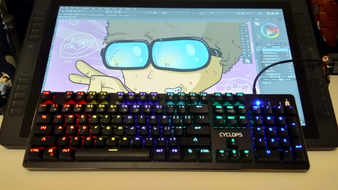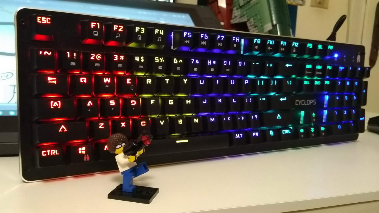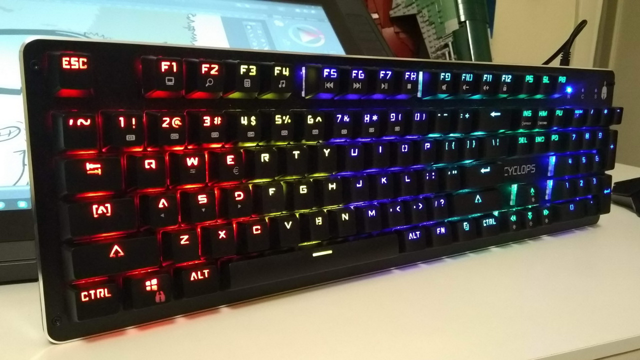 Που ξεχωρίζει τελικά το Cyclops; Όλα έχουν να κάνουν με το φωτισμό του. Τα πλήκτρα είναι φωτιζόμενα, με το κάθε ένα να έχει δικό του αποκλειστικό LED. Μάλιστα τα LED για ενεργοποίηση/απενεργοποίηση caps lock, numpad κ.ο.κ. είναι τόσο έντονα που σε σκοτεινό δωμάτιο όλα θα είναι απέραντα μπλε για πάντα. Τα όμορφα ξεκινούν με τη διαπίστωση πως δεν έχετε δυνατότητα αλλαγής χρωμάτων στα πλήκτρα του. Είναι χωρισμένα σε 6 μεγάλες χρωματικές περιοχές και δίνεται συγκεκριμένο χρώμα σε συγκεκριμένα πλήκτρα μονίμως. Κόκκινο, κίτρινο, μοβ, γαλάζιο, πράσινο και μπλε περιέχει η χρωματική παλέτα από τα αριστερά προς τα δεξιά του, με απώτερο σκοπό να διευκολύνει περισσότερο τον άμεσα ενδιαφερόμενο ενός τέτοιου πληκτρολογίου, τον gamer. Μπορείτε πάντα να αλλάξετε την ένταση του φωτισμού ή και να την απενεργοποιήσετε τελείως, αλλά όλο το ζουμί βρίσκεται στα διαφορετικά lighting modes.